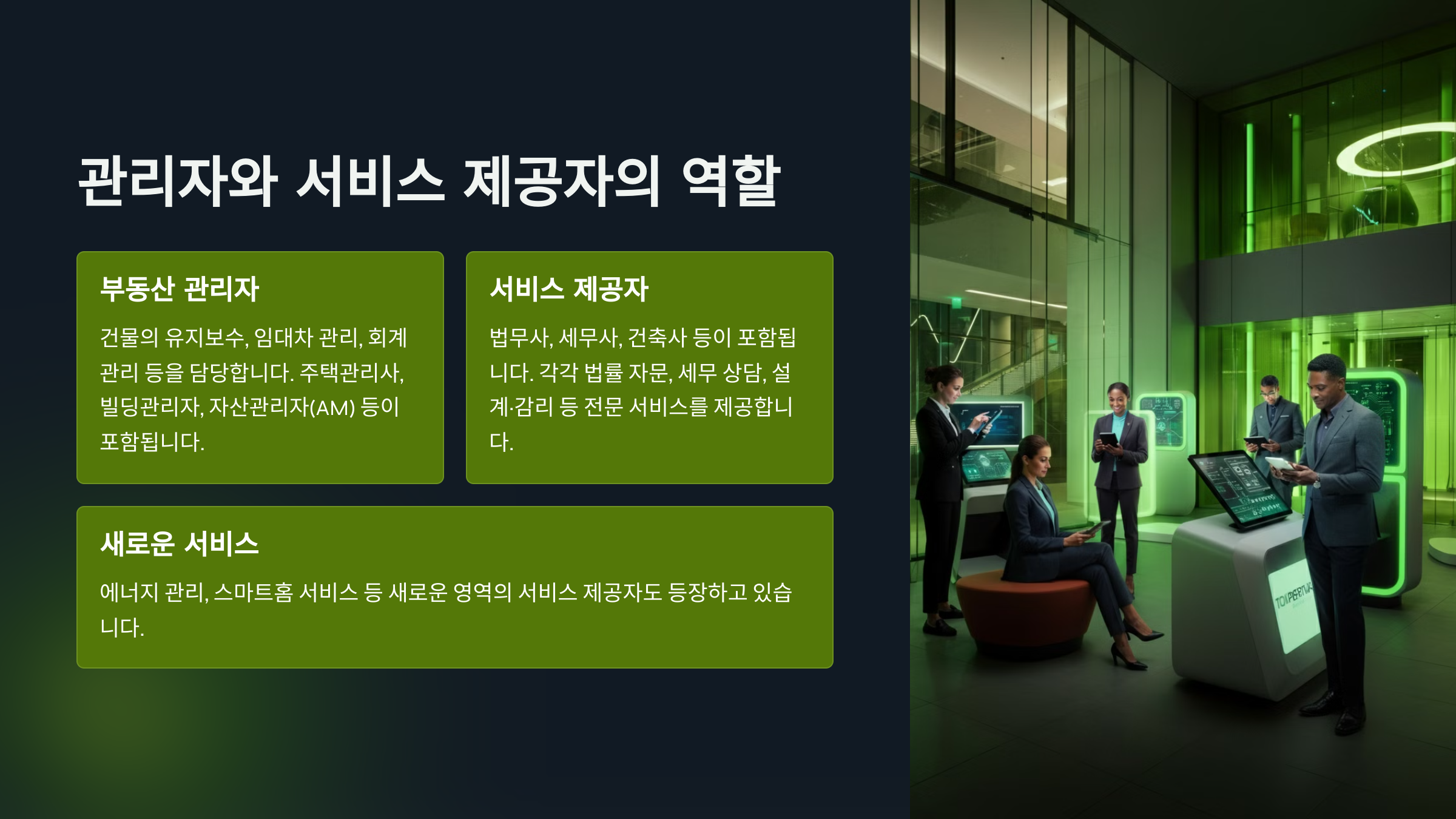 부동산 서비스 제공자에는 법무사, 세무사, 건축사 등이 포함됩니다. 이들은 각각 법률 자문, 세무 상담, 설계·감리 등 전문 서비스를 제공합니다. 최근에는 에너지 관리, 스마트홈 서비스 등 새로운 영역의 서비스 제공자도 등장하고 있습니다.