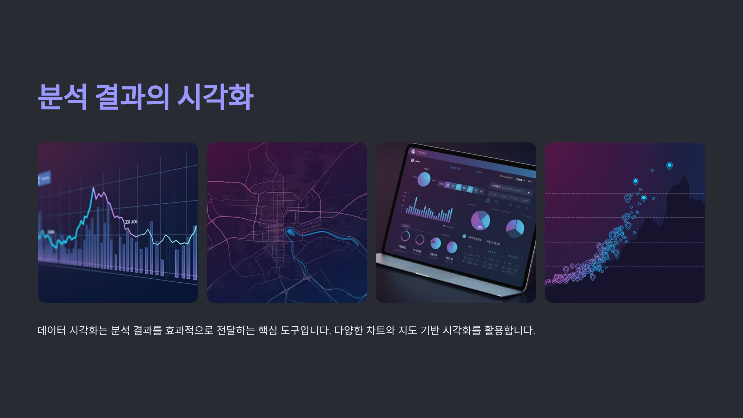 데이터 시각화는 분석 결과를 효과적으로 전달하는 핵심 도구입니다. 시계열 그래프, 산점도, 히트맵 등 다양한 차트를 활용합니다. 지도 기반 시각화는 공간적 패턴을 직관적으로 보여줍니다. 시각화 도구 선택은 데이터의 특성과 전달하고자 하는 메시지에 따라 달라집니다.