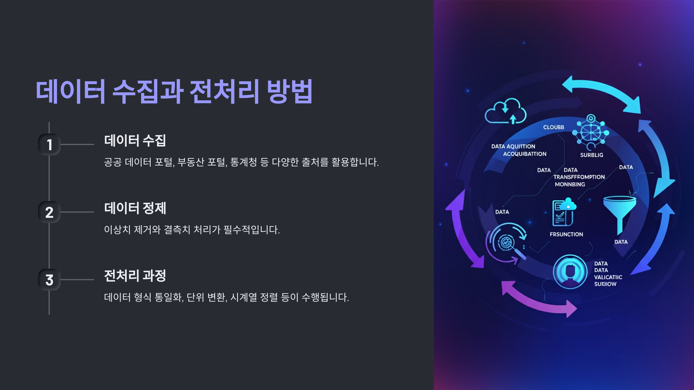 데이터 수집은 공공 데이터 포털, 부동산 포털, 통계청 등 다양한 출처를 활용합니다. 한국부동산원, 국토교통부, 각종 민간 부동산 정보 업체의 데이터베이스가 주요 소스입니다. 수집된 데이터는 정제 과정을 거쳐야 하며, 이상치 제거와 결측치 처리가 필수적입니다. 데이터의 품질은 분석 결과의 신뢰성을 좌우합니다.