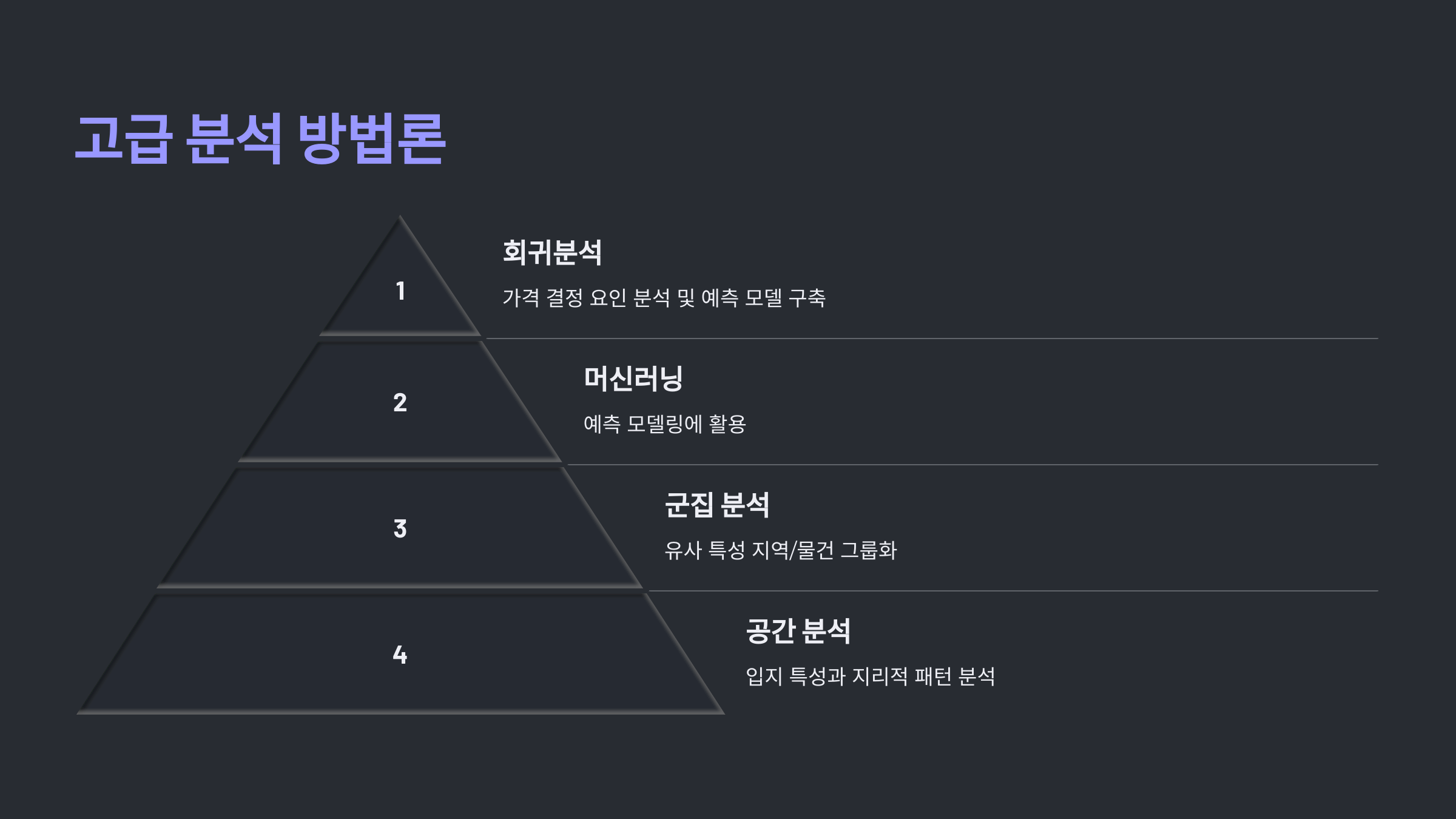 군집 분석을 통해 유사한 특성을 가진 지역이나 물건을 그룹화할 수 있습니다. 공간 분석 기법은 입지 특성과 지리적 패턴을 분석하는데 사용됩니다. 텍스트 마이닝을 통해 부동산 시장의 여론과 트렌드를 분석하기도 합니다. 이러한 고급 분석은 시장의 심층적 이해를 가능하게 합니다.