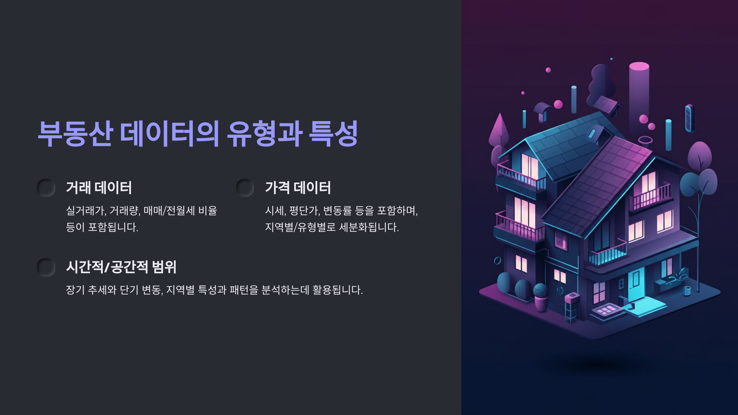 부동산 데이터는 크게 거래 데이터, 가격 데이터, 인구통계 데이터, 경제지표 데이터로 구분됩니다. 거래 데이터에는 실거래가, 거래량, 매매/전월세 비율 등이 포함됩니다. 가격 데이터는 시세, 평단가, 변동률 등을 포함하며, 지역별/유형별로 세분화됩니다. 이러한 데이터의 특성을 이해하는 것이 분석의 첫걸음입니다.