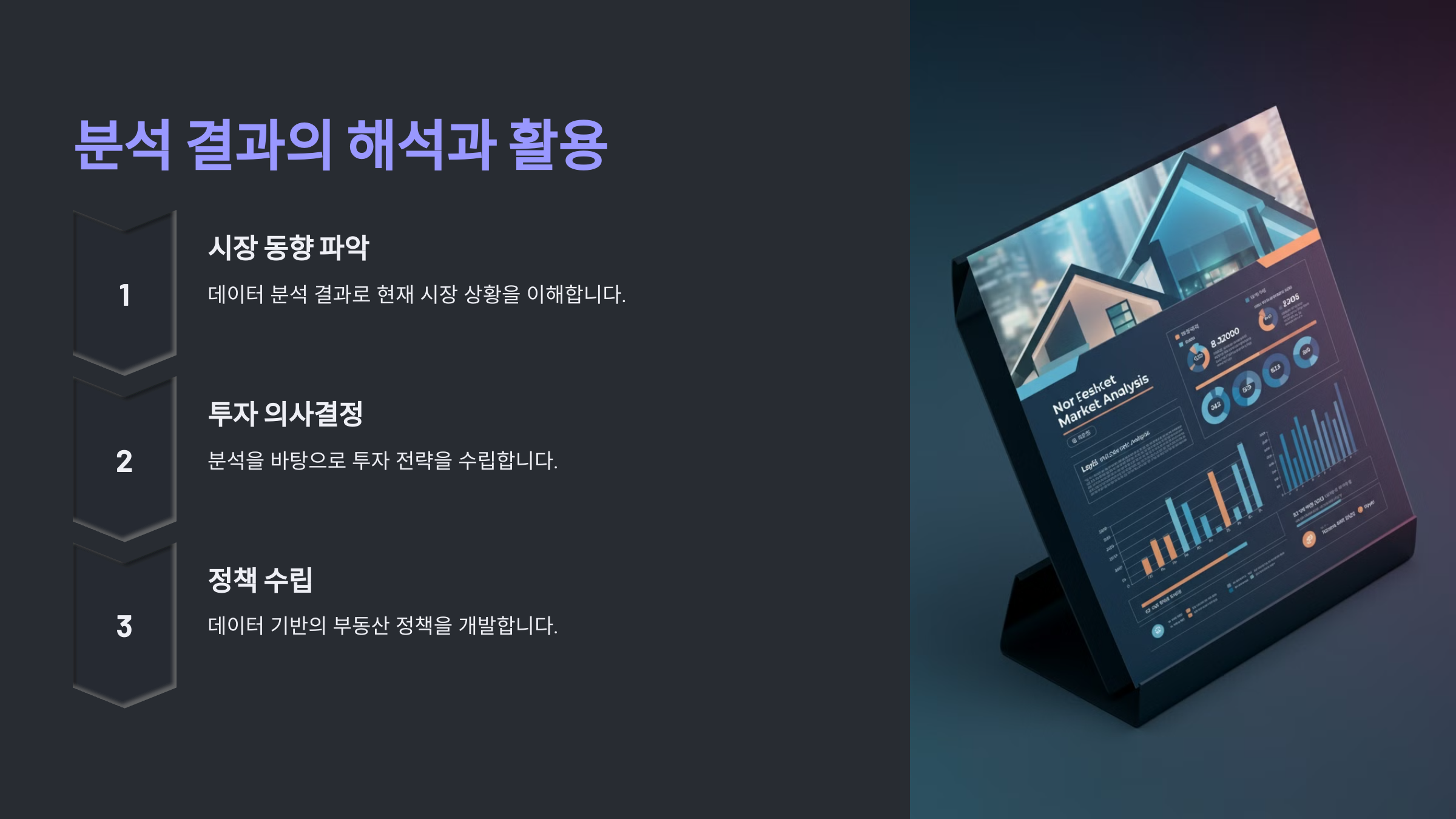 데이터 분석 결과는 시장 동향 파악, 투자 의사결정, 정책 수립 등 다양한 목적으로 활용됩니다. 결과 해석 시에는 데이터의 한계와 불확실성을 고려해야 합니다. 통계적 유의성과 실무적 의미를 구분하여 해석하는 것이 중요합니다. 부동산 시장의 역사와 주요 변화 동향을 참고하면 더 깊이 있는 해석이 가능합니다.