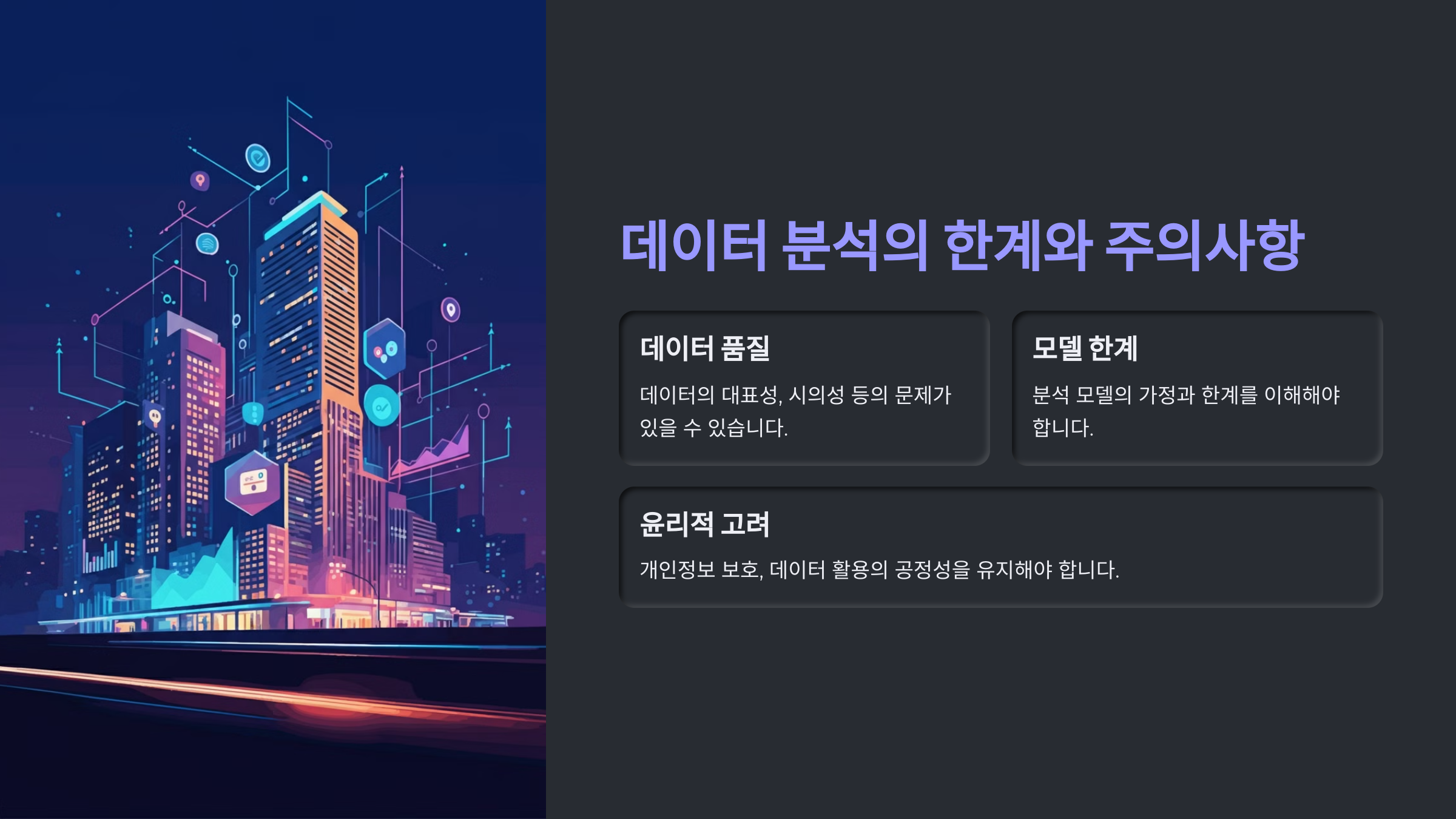 부동산 데이터 분석에는 여러 한계점이 존재합니다. 데이터의 품질, 대표성, 시의성 등의 문제가 있을 수 있습니다. 분석 모델의 가정과 한계를 이해하고 있어야 합니다. 특히 예측 모델의 경우, 시장의 급격한 변화나 예상치 못한 이벤트에 취약할 수 있습니다.