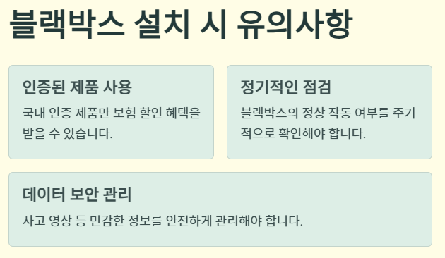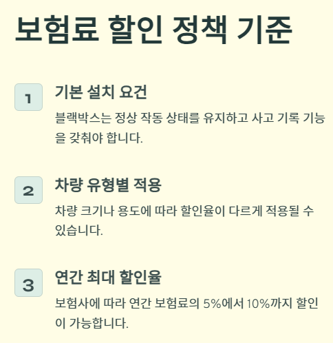 - 기본 설치 요건: 보험료 할인 혜택을 받으려면 블랙박스가 반드시 작동 상태를 유지하고 있어야 하며, 사고 기록을 저장할 수 있는 기능을 갖춘 기기여야 합니다.