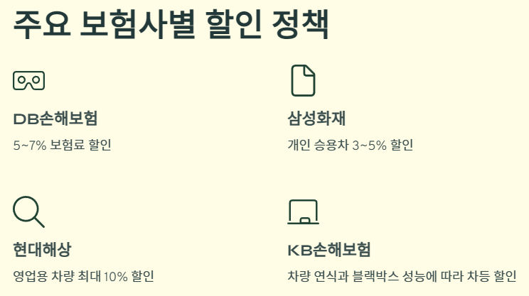 - KB손해보험: 차량 연식과 블랙박스 성능에 따라 차등 할인.