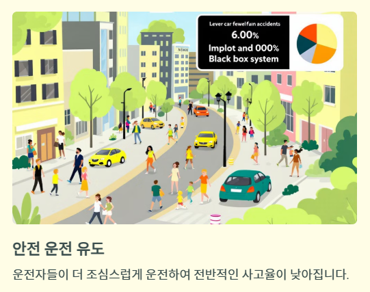 블랙박스가 설치된 차량의 운전자들은 사고 발생 시 기록이 남는다는 사실을 인지하고, 자연스럽게 더 안전하게 운전하려는 경향이 있습니다. 이는 사고율을 낮추는 결과로 이어지고, 보험사 역시 이를 반영하여 보험료를 할인합니다.