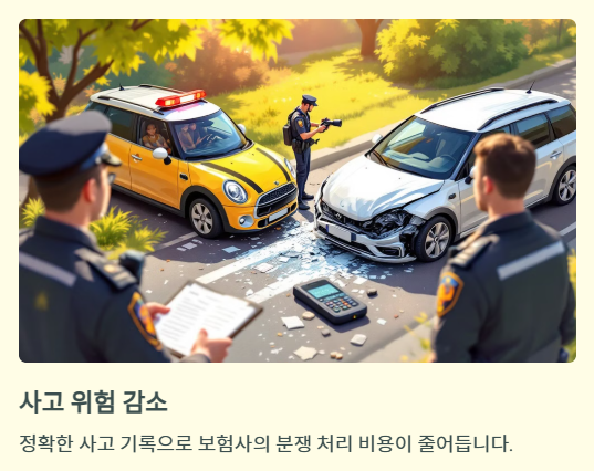 블랙박스를 통해 사고 상황을 명확히 기록하면 사고 처리 시간이 단축됩니다. 보험사가 사건을 신속히 해결할 수 있어 운전자 입장에서도 불필요한 스트레스를 줄일 수 있습니다.