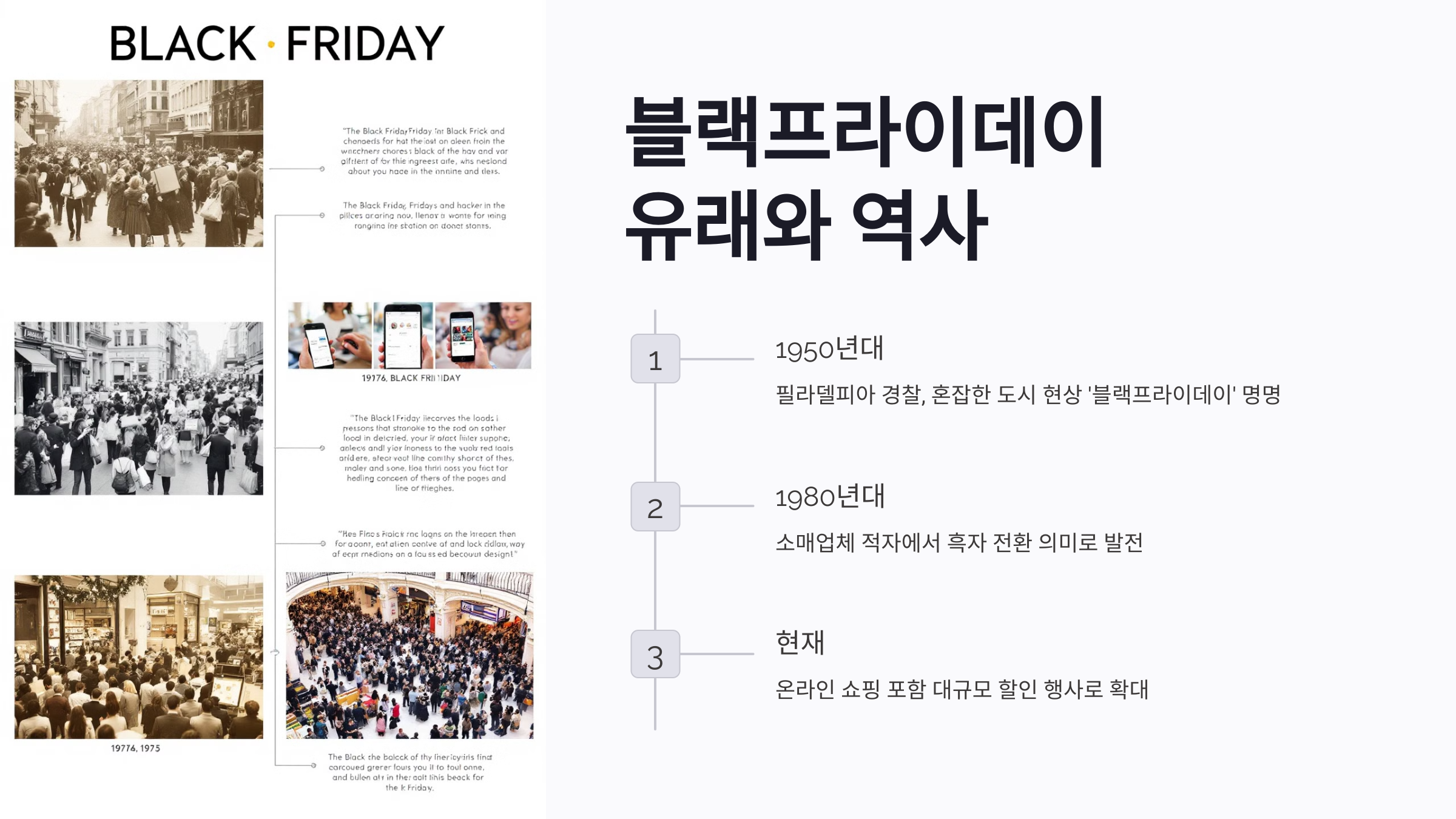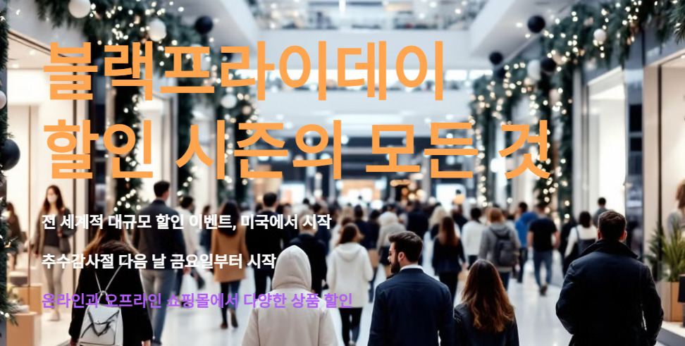 블랙프라이데이는 미국의 추수감사절(Thanksgiving) 다음 날인 금요일에 진행되는 대규모 할인 행사로, 그 기원은 1950년대 필라델피아로 거슬러 올라갑니다. 필라델피아 경찰들은 추수감사절 다음 날이 되면 도시가 혼잡해지고, 상점과 도로가 검게 물드는 현상을 ‘블랙프라이데이’라 불렀습니다. 이후 이 용어가 상업적으로 사용되기 시작하면서 할인과 대규모 쇼핑 시즌을 상징하는 이름으로 자리 잡았습니다.