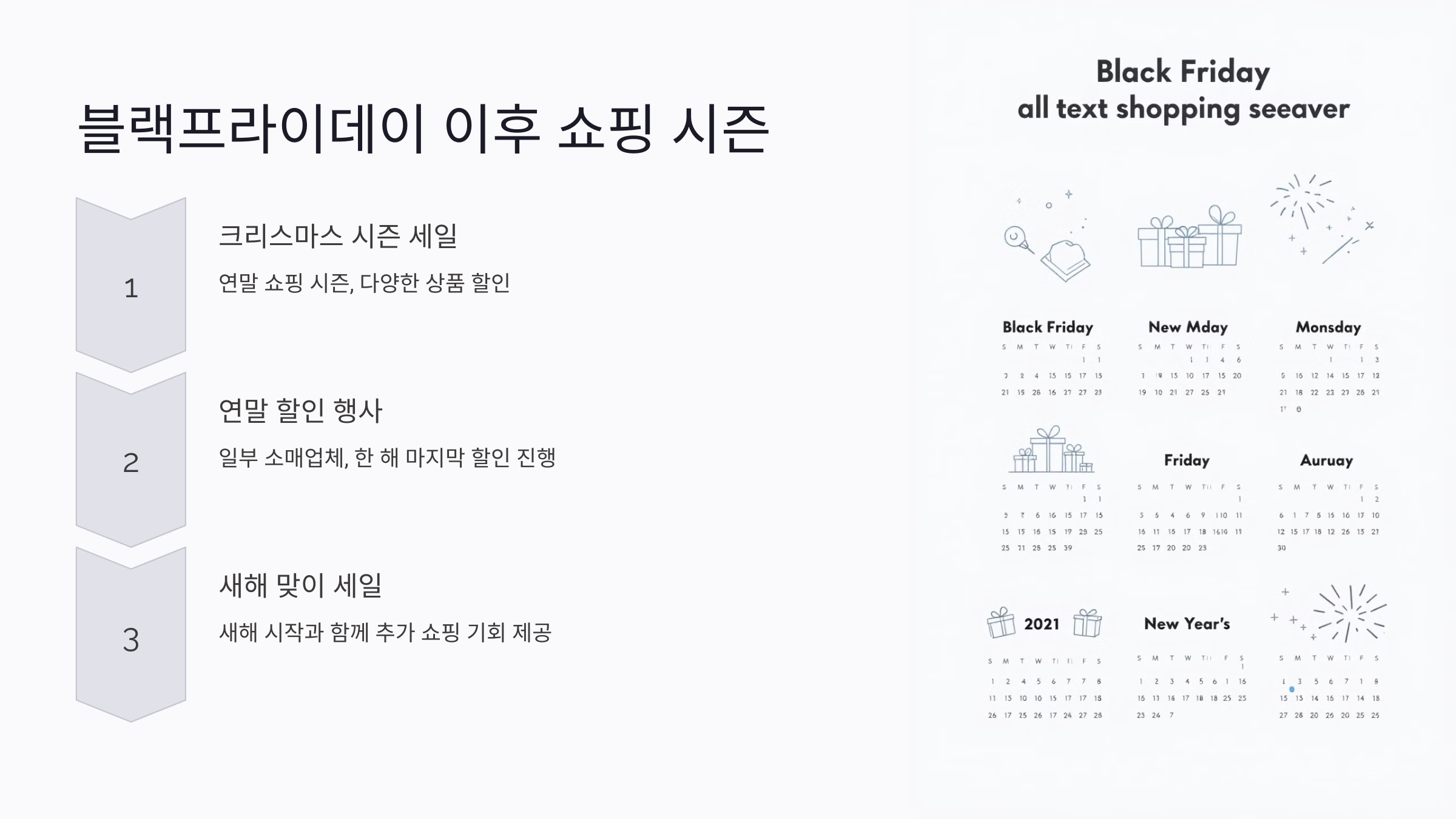블랙프라이데이와 사이버 먼데이 이후에도 다양한 쇼핑 시즌이 이어집니다. 연말 쇼핑 시즌으로 '크리스마스 시즌 세일'이 시작되며, 일부 소매업체는 한 해의 마지막 할인 행사를 진행하기도 합니다. 또한, 새해 맞이 세