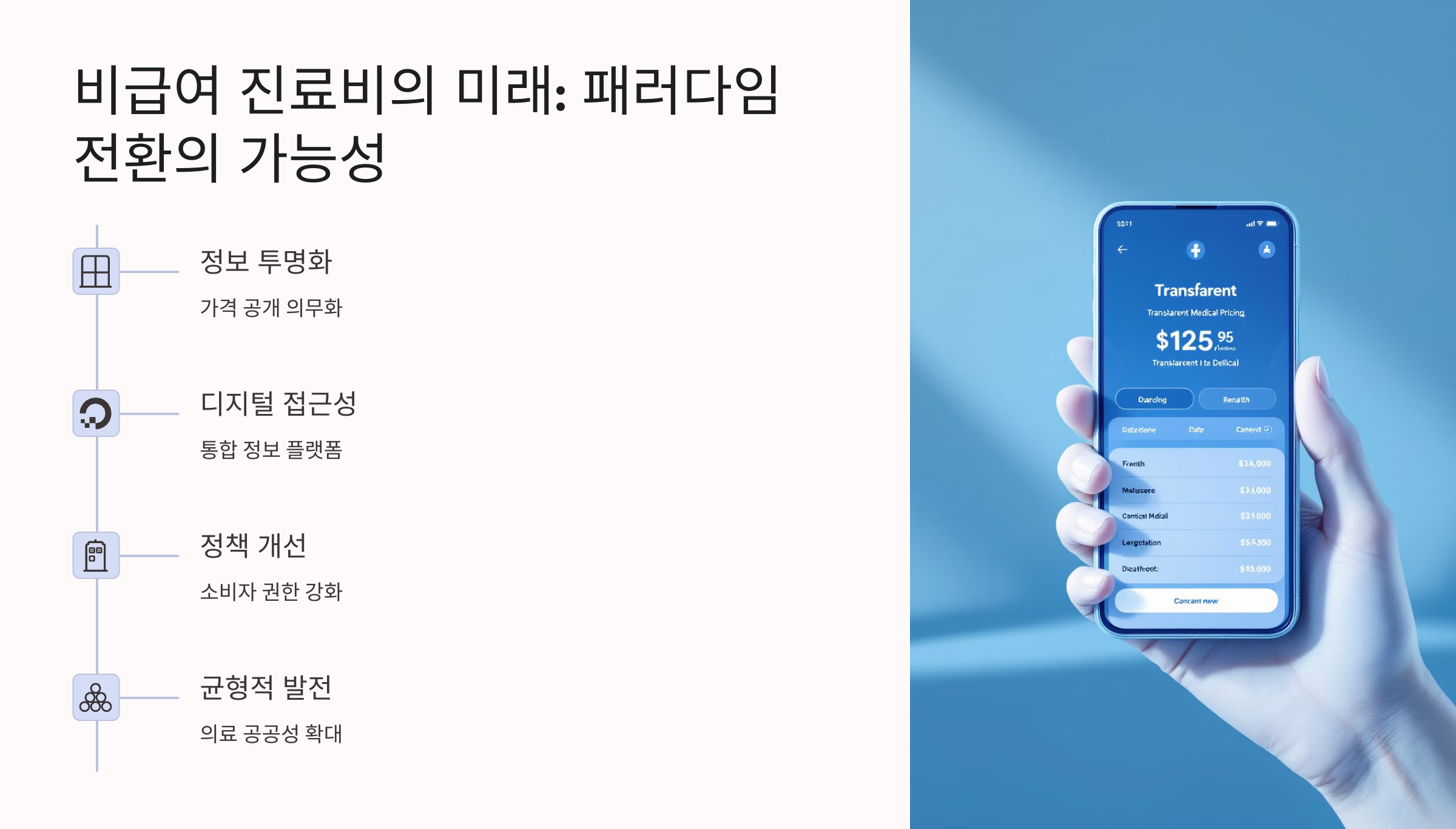 장기적으로는 필수적 의료 서비스의 급여화를 통한 보장성 강화가 근본적 해결책이 될 수 있습니다. 현재 정부의 '건강보험 보장성 강화 정책'은 MRI, 초음파 등 주요 비급여 항목의 단계적 급여화를 추진하고 있으나, 재정적 제약과 이해관계자 간 갈등으로 진전이 더딘 상황입니다. 이러한 구조적 변화와 병행하여, 비급여 진료비 정보 공개 시스템의 질적 개선—가격 정보를 넘어 의료의 질적 정보 포함, 사용자 친화적 인터페이스 개발 등—도 필요합니다.