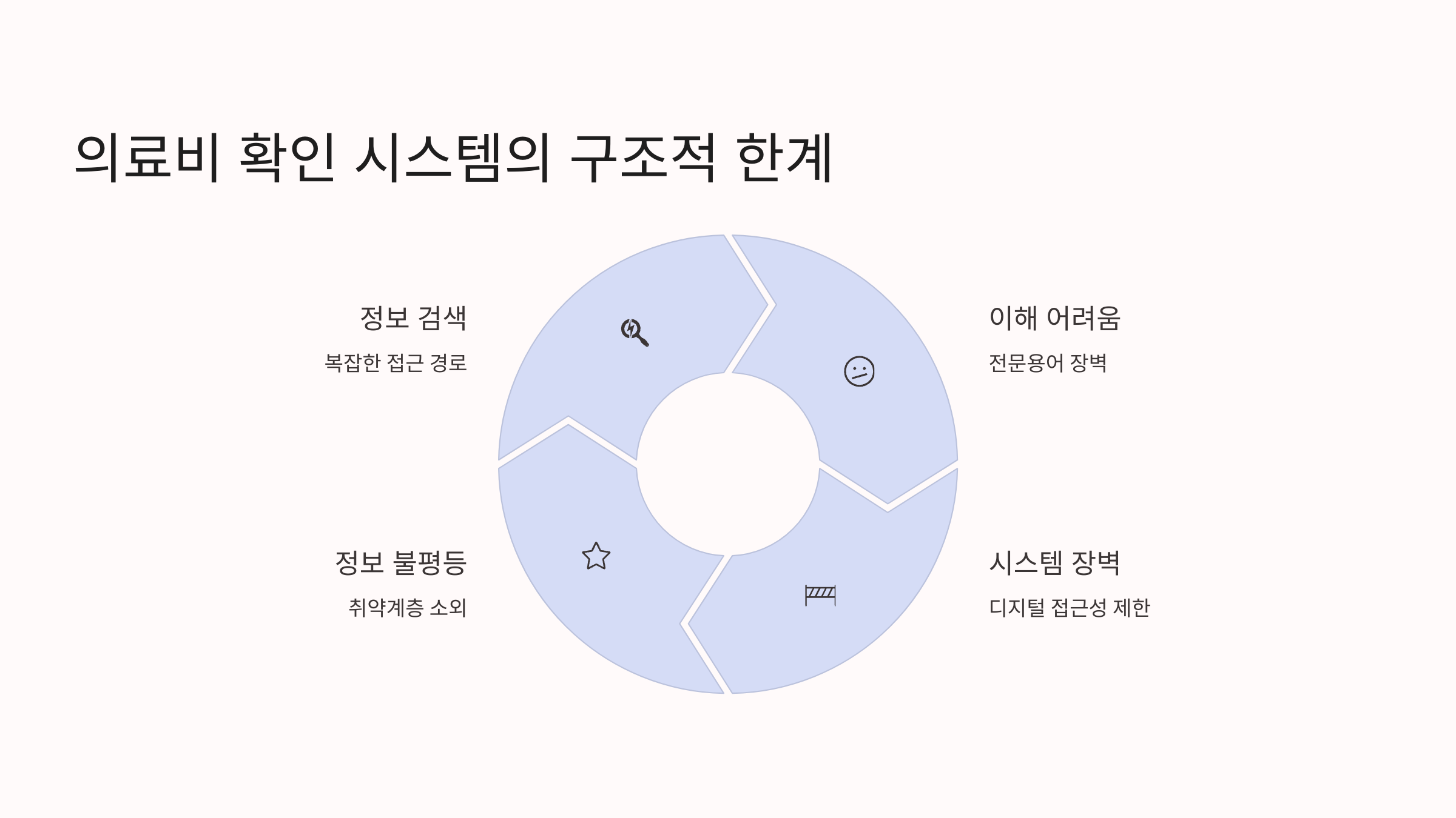 심사평가원의 정보 제공 시스템은 사용자 경험 측면에서도 한계가 분명합니다. 복잡한 분류 체계, 전문 용어 중심의 구성, 비직관적인 검색 기능은 디지털 리터러시가 낮은 계층—주로 노년층, 저소득층 등 의료 취약계층—에게 추가적인 장벽으로 작용합니다.