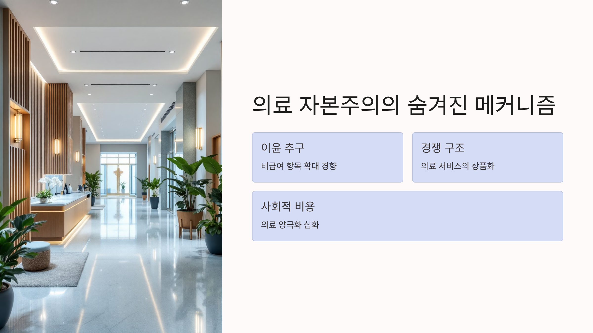 한국의 비급여 진료비 체계는 단순한 행정 시스템이 아니라 의료 자본주의의 작동 메커니즘을 반영합니다. 표면적으로는 '환자의 선택권'과 '의료기관의 자율성'이라는 가치를 표방하지만, 그 이면에는 의료 상품화의 경제적 논리가 작동합니다.