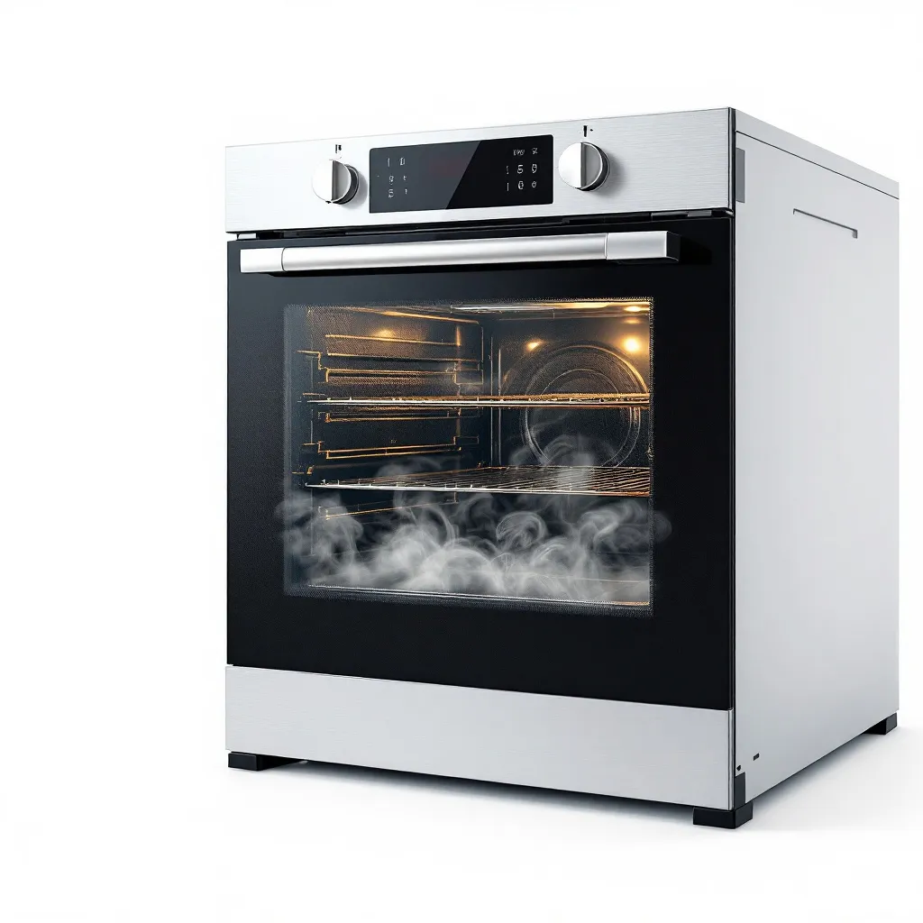 스팀 기능이 있는 오븐은 물탱크에서 물을 가열해 수증기를 발생시키는 방식으로 작동합니다. 이 수증기가 오븐 내부로 들어가 음식 표면에 수분을 유지시켜 촉촉한 식감을 만들어줍니다.
