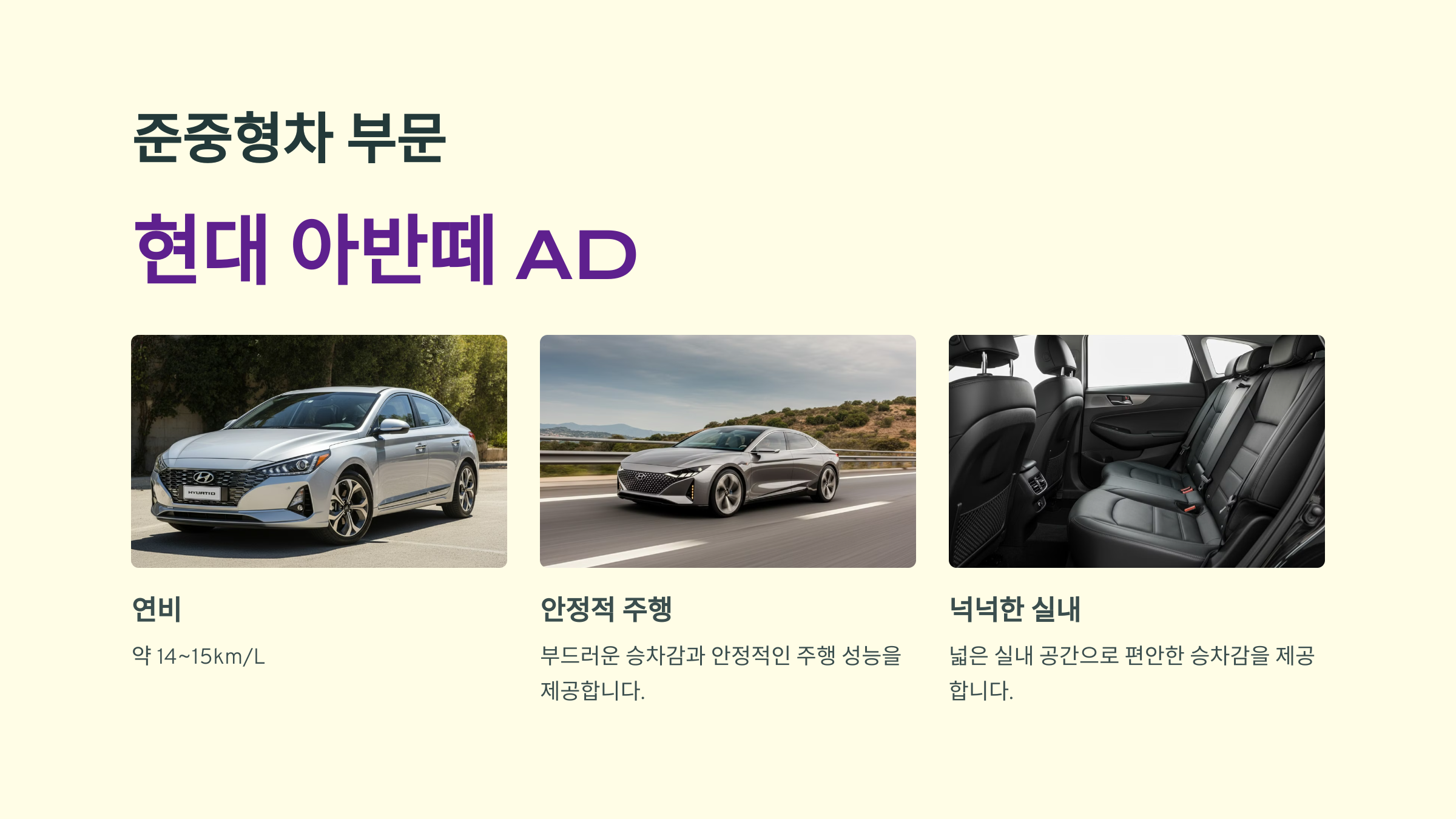 현대 아반떼 AD는 준중형차임에도 높은 연비를 자랑하며, 주행 안정성까지 갖춘 모델입니다. 특히 장거리 주행과 도심 주행 모두에 적합하여 다양한 용도로 활용이 가능합니다.