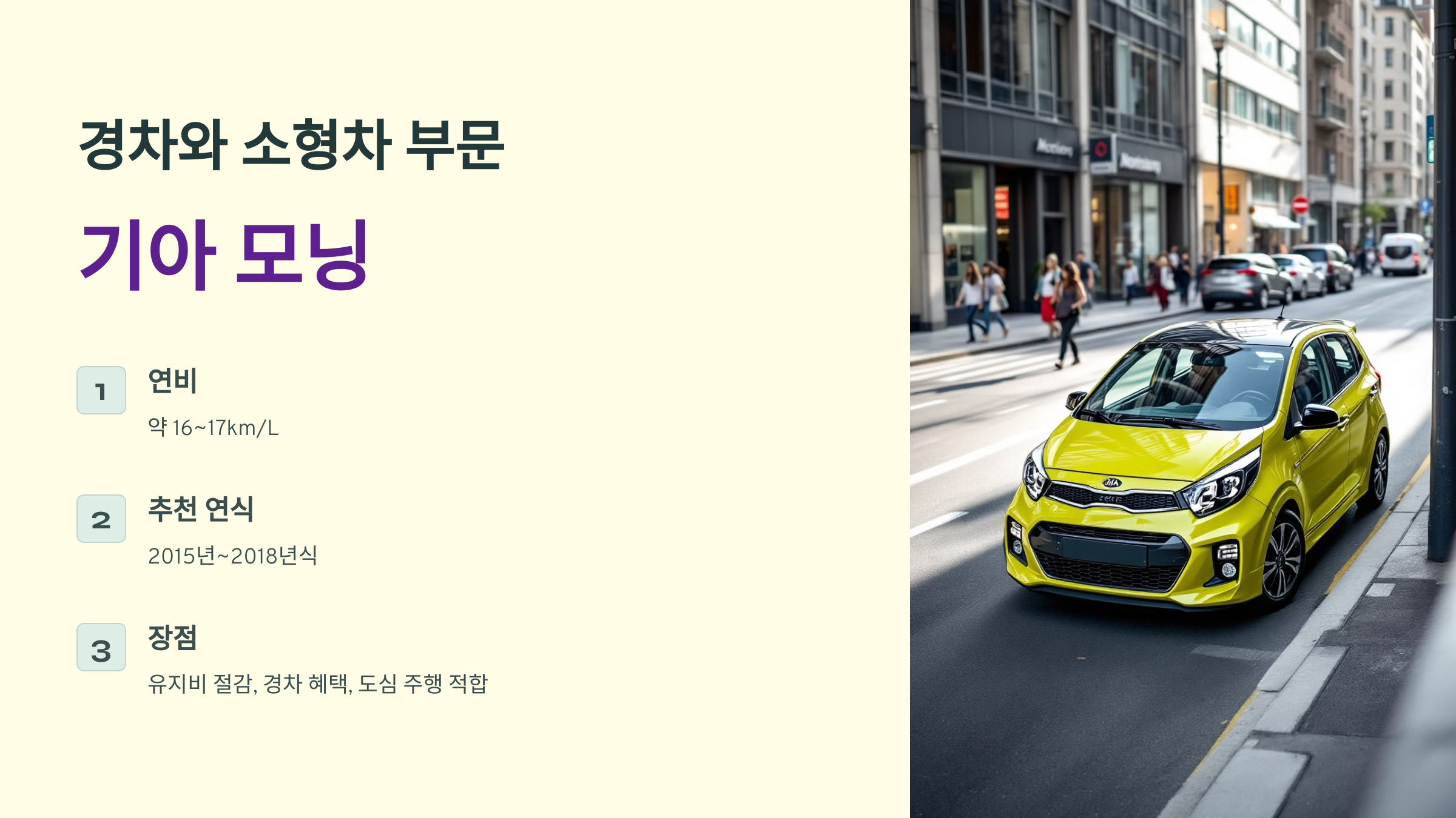- 주요 장점: 유지비 절감, 경차 혜택, 도심 주행에 적합
