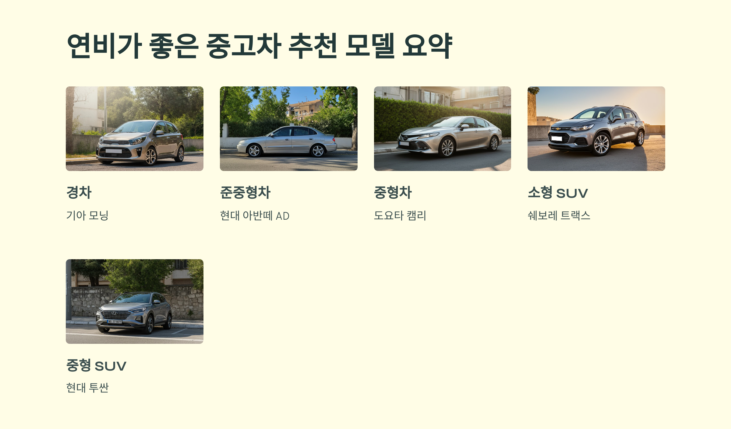 중고차를 예산에 맞춰 찾을 때 연비를 고려하는 것은 장기적인 비용 절감에 매우 유리합니다. 위 추천 모델들은 각각의 차급에서 연비와 유지비 면에서 뛰어난 성능을 보이는 차량들이며, 다양한 주행 환경에서 실속 있는 선택이 될 수 있습니다.