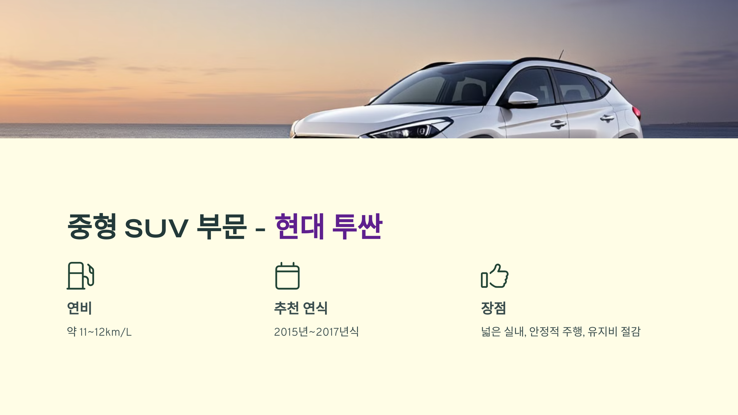투싼은 가성비 좋은 중형 SUV로, 넉넉한 공간과 실용성 덕분에 가족 단위로 차량을 사용하는 소비자들에게 인기가 많습니다. 특히, 장거리 주행에서도 편안함을 유지할 수 있는 차량입니다.