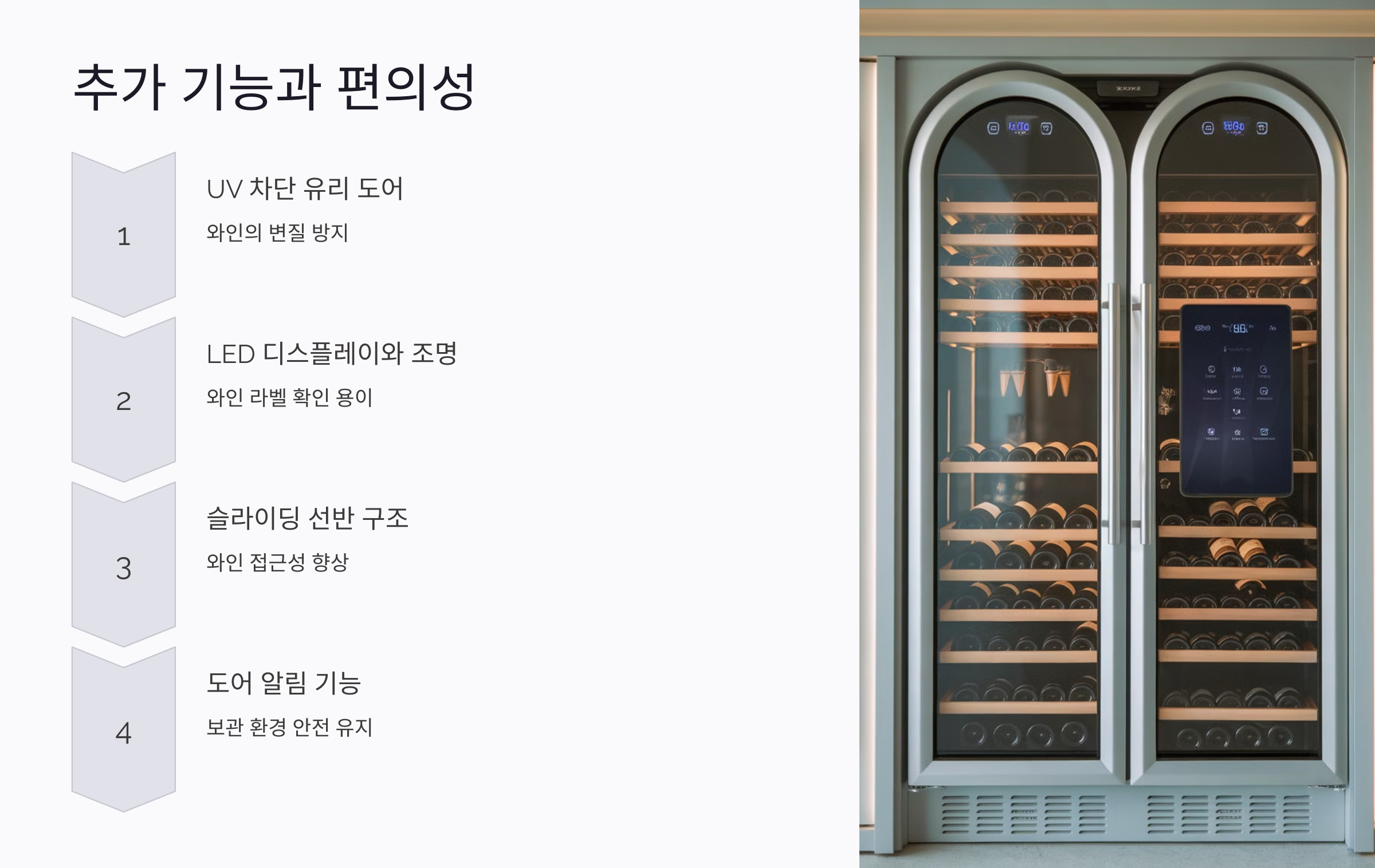 현대의 와인냉장고는 다양한 편의 기능을 제공합니다. UV 차단 유리는 와인의 변질을 막아주며, LED 조명은 와인 라벨 확인을 용이하게 합니다. 슬라이딩 선반은 와인 접근성을 높여주고, 도어 알림 기능은 보관 환경을 안전하게 유지하는데 도움이 됩니다. 이러한 부가 기능들의 필요성을 검토해야 합니다.