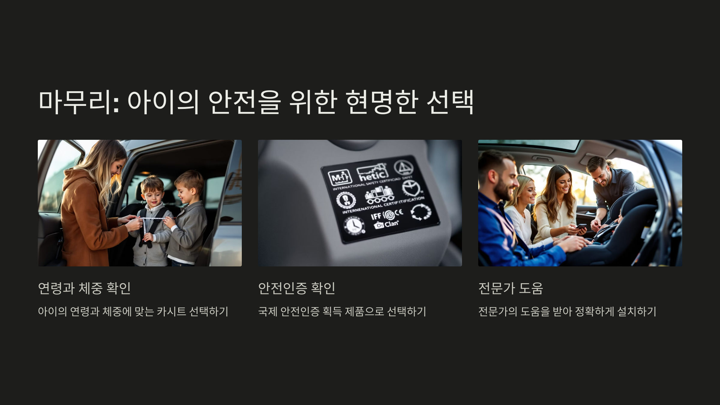 카시트는 아이의 안전을 지키는 마지막 보루입니다. 비용을 아끼기보다는 검증된 안전성과 편의성을 갖춘 제품을 선택하는 것이 현명합니다. 구매 후에도 올바른 설치와 관리를 통해 카시트의 안전성을 지속적으로 유지해야 합니다.