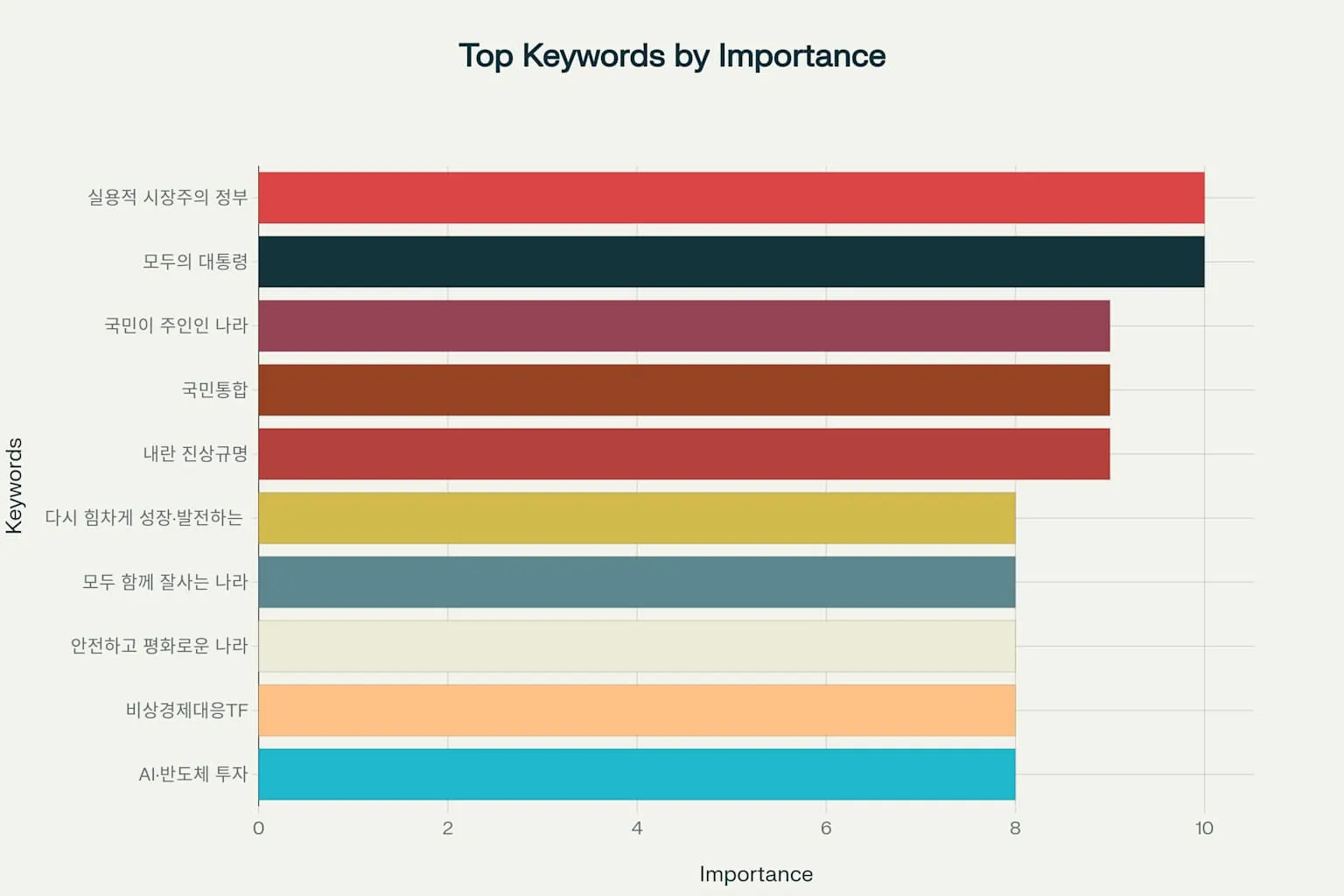 이재명 대통령 취임사에서 '모두의 대통령'이라는 키워드가 최고 중요도(10/10)를 받은 것은 분열된 사회의 통합이 시급한 과제임을 반영합니다.