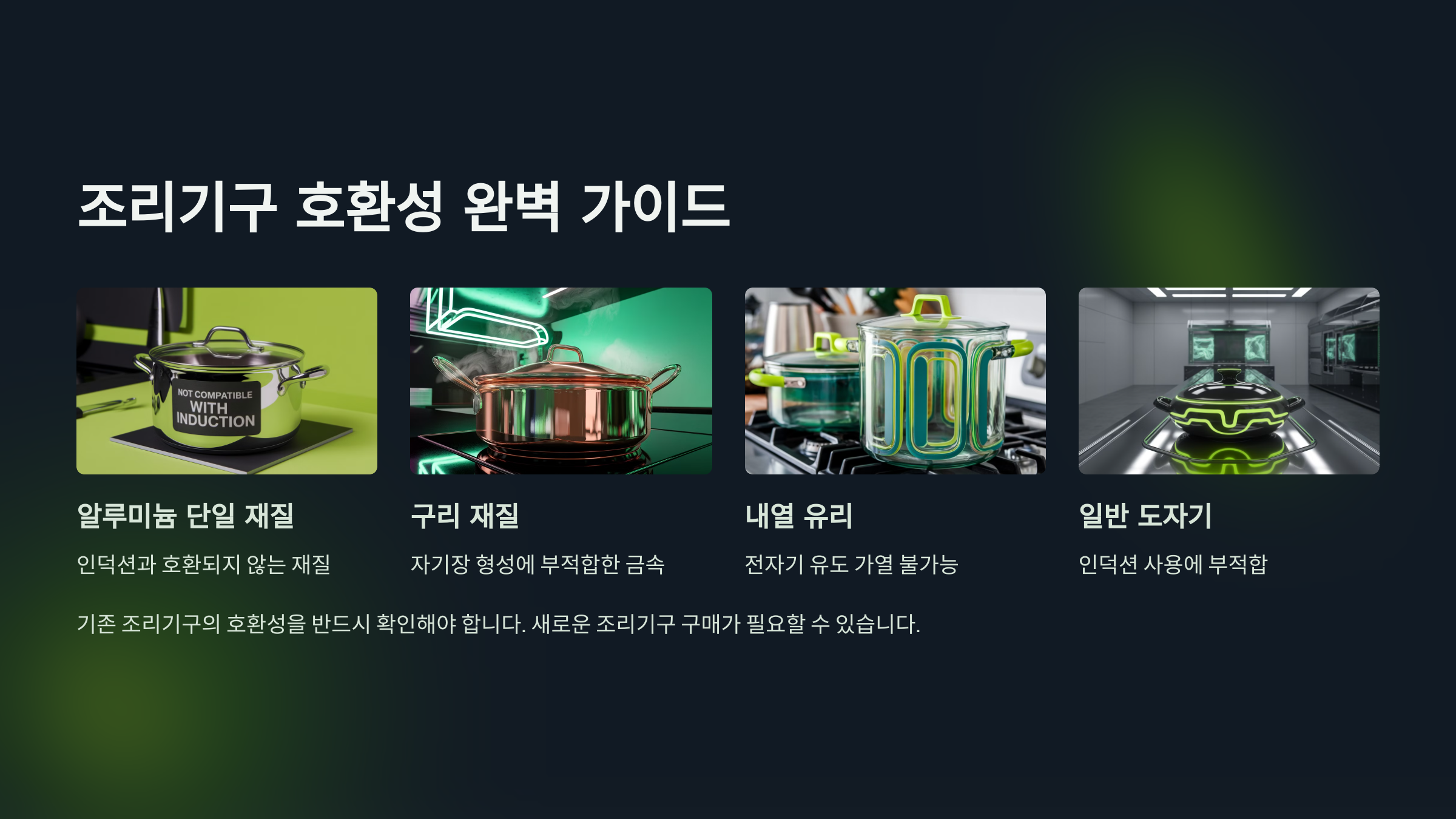 인덕션은 자성을 이용한 조리 방식을 사용합니다. 모든 조리기구가 인덕션에 사용할 수 있는 것은 아닙니다. 기존 조리기구의 호환성을 반드시 확인해야 합니다. 새로운 조리기구 구매가 필요할 수 있다는 점을 고려해야 합니다. 이는 초기 구매 비용에 영향을 미칠 수 있습니다.