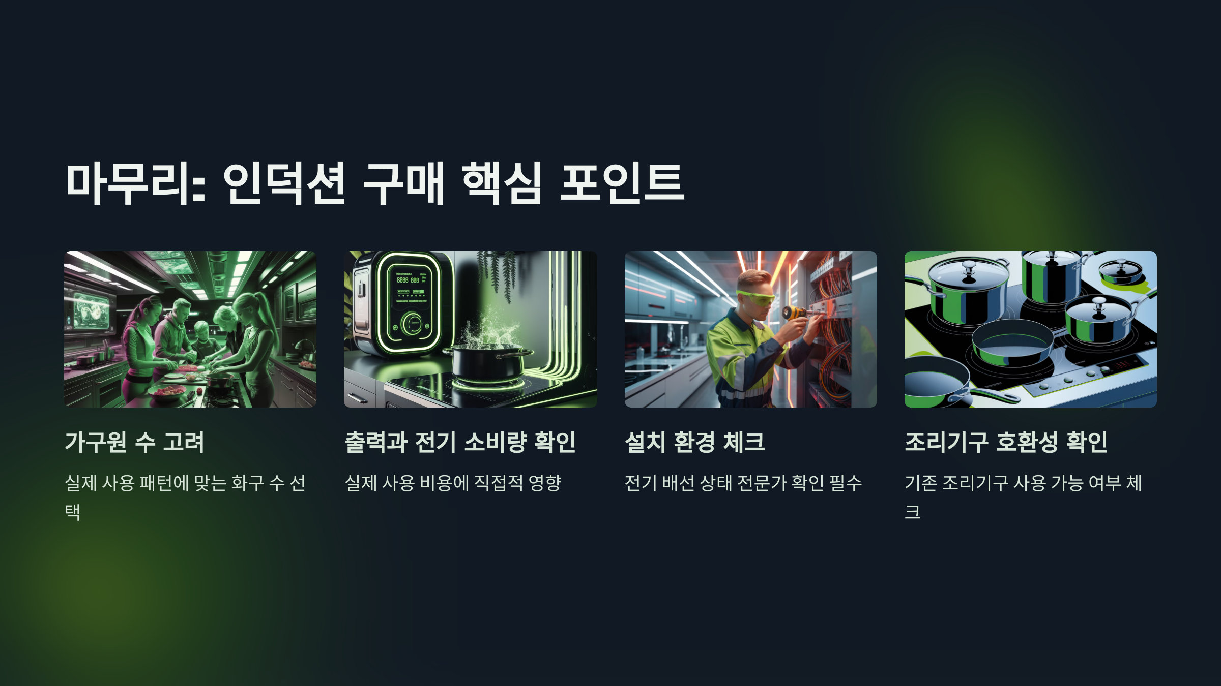인덕션 구매는 단순히 제품의 가격만 보고 결정할 수 없는 중요한 선택입니다. 가구원 수와 실제 사용 패턴을 고려한 화구 수 선택이 가장 기본이 되어야 합니다. 출력과 전기 소비량은 실제 사용 비용에 직접적인 영향을 미치는 중요한 요소입니다. 설치 환경과 조리기구의 호환성까지 꼼꼼히 체크한다면 후회 없는 선택이 가능할 것입니다.