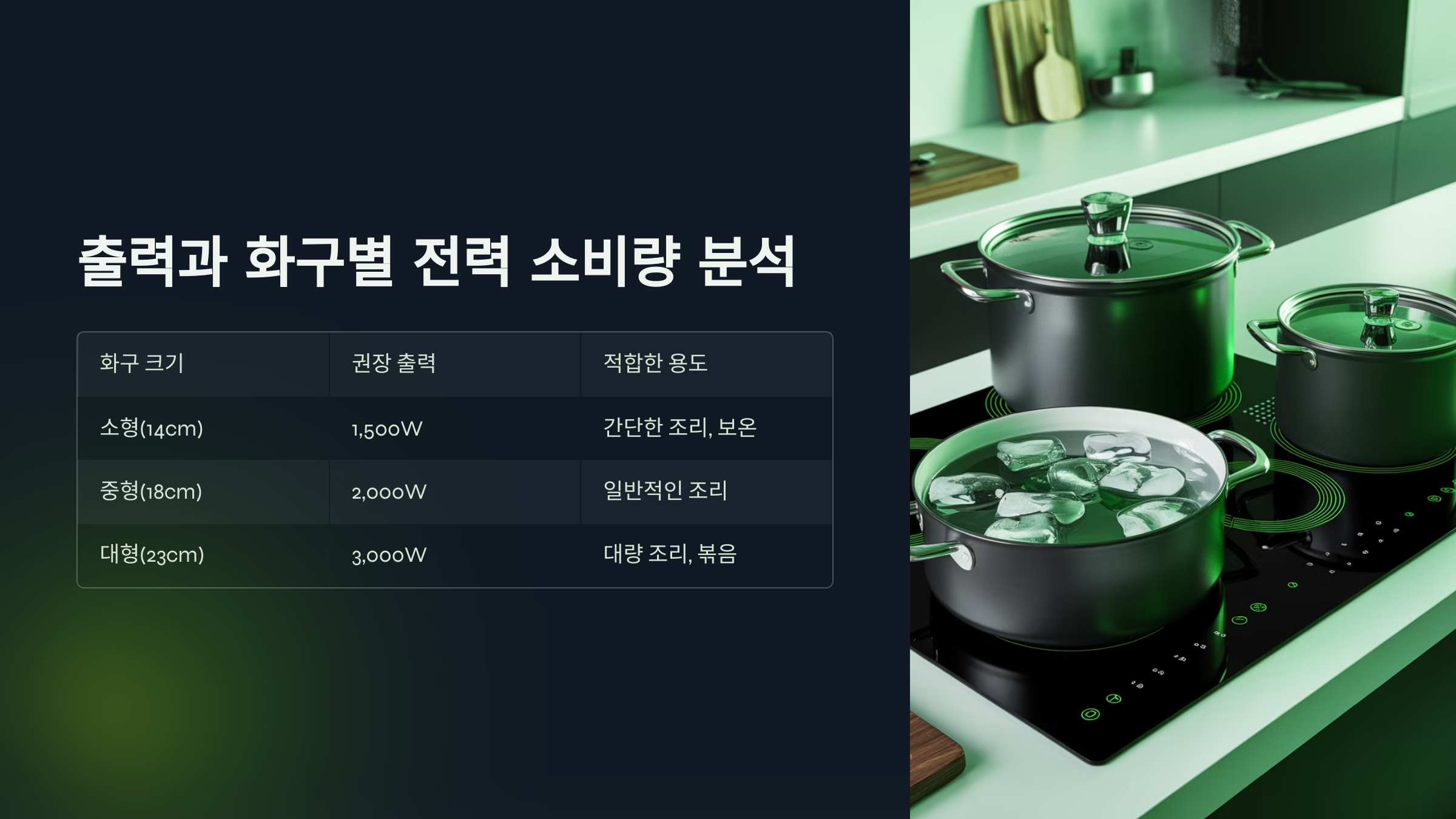 인덕션의 출력은 실제 조리 시간과 직결됩니다. 일반적으로 가정용 인덕션은 화구당 1,500W에서 3,000W 사이의 출력을 제공합니다. 높은 출력은 빠른 조리를 가능하게 하지만 그만큼 전력 소비도 증가합니다. 실제 가정에서는 최대 출력을 자주 사용하지 않는다는 점을 고려해야 합니다. 따라서 적절한 출력 선택이 중요합니다.