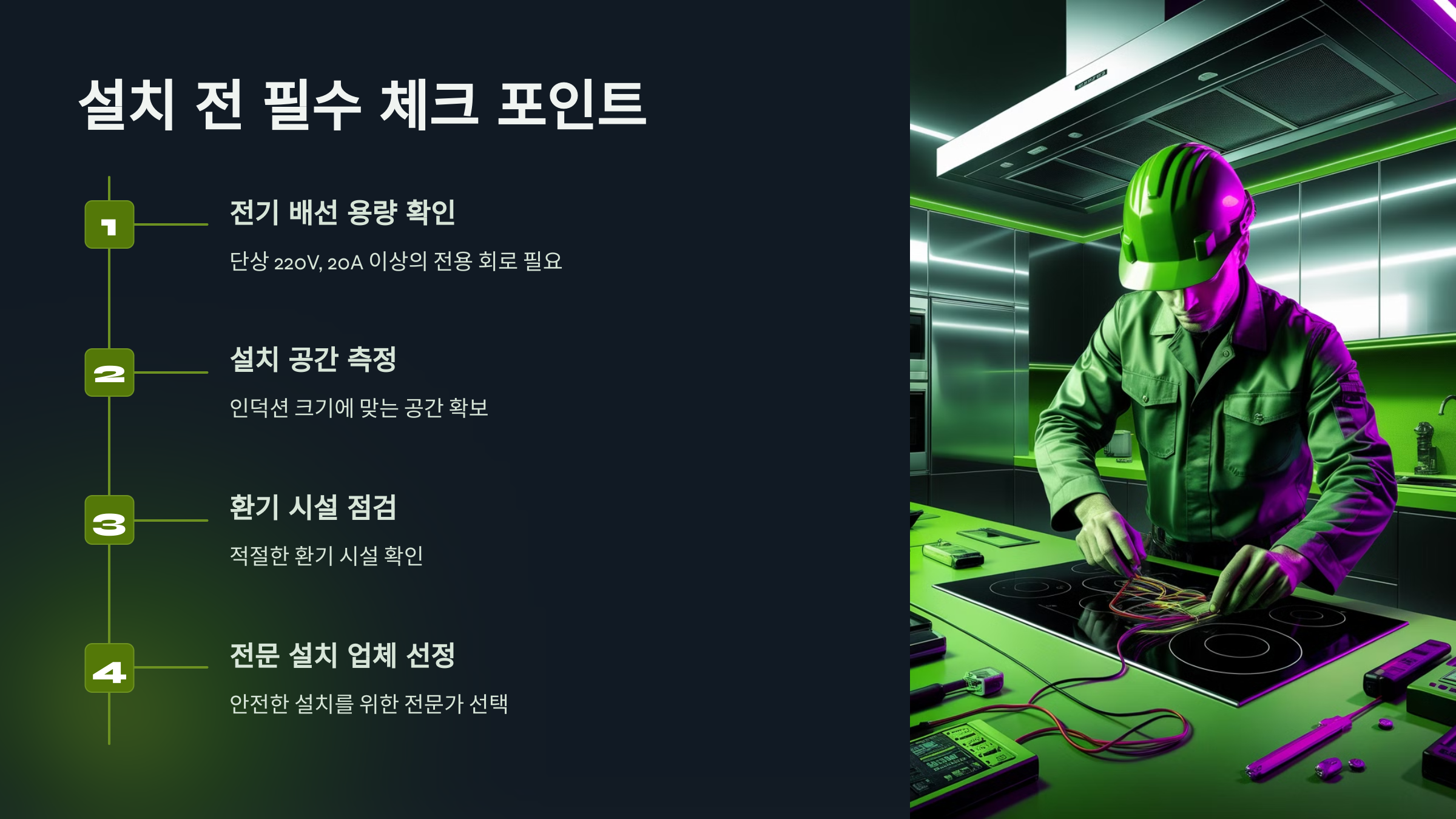 인덕션 설치를 위해서는 전기 배선 상태가 매우 중요합니다. 일반적으로 인덕션은 단상 220V, 20A 이상의 전용 회로가 필요합니다. 아파트의 경우 대부분 문제없이 설치가 가능합니다. 오래된 주택의 경우 배선 공사가 필요할 수 있습니다. 설치 전 반드시 전문가의 확인이 필요합니다.