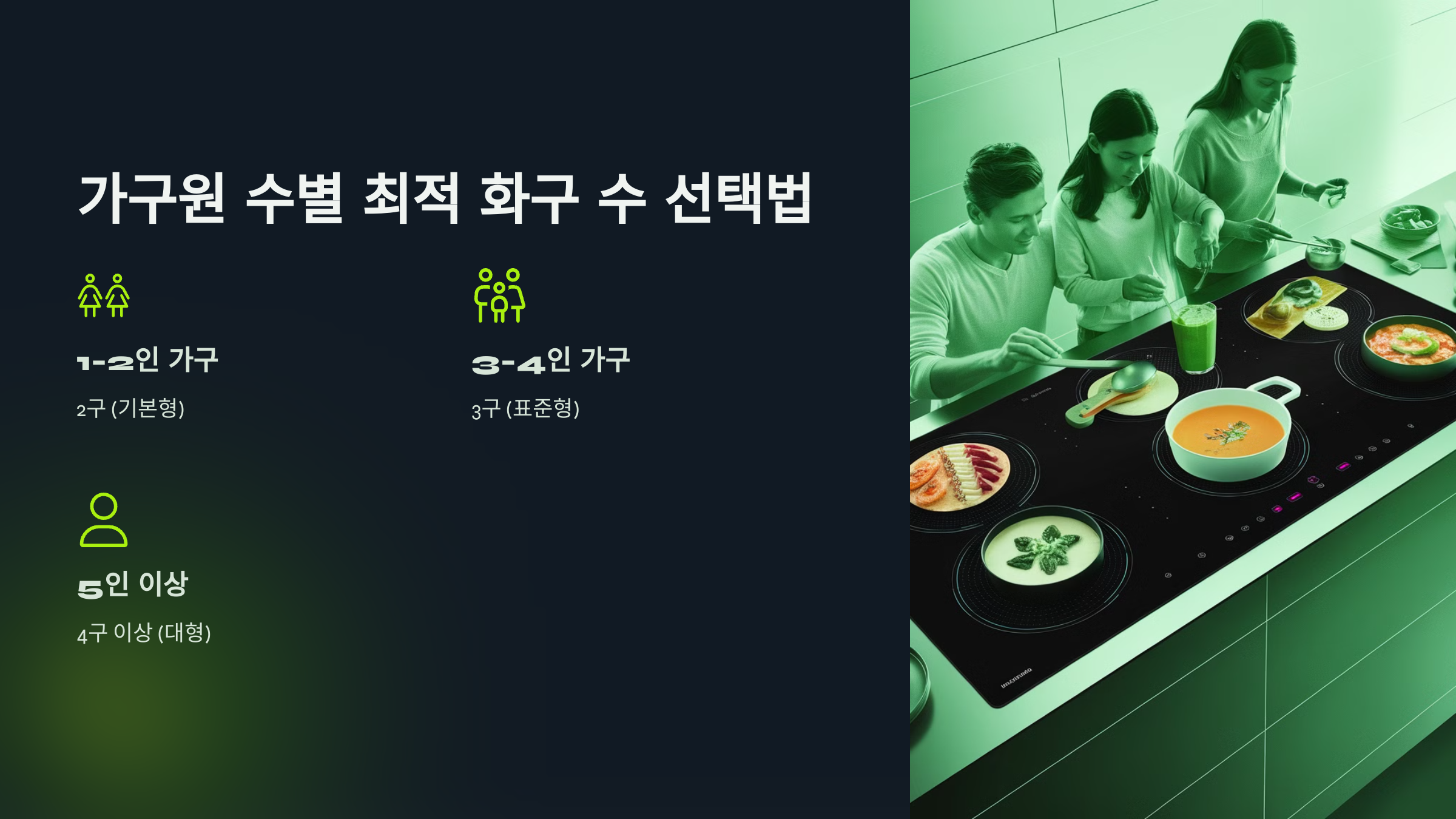 인덕션 선택시 가구원 수는 매우 중요한 고려사항입니다. 1-2인 가구는 2구 인덕션으로도 충분할 수 있습니다. 3-4인 가구는 3구 인덕션이 가장 적합한 선택이 됩니다. 동시에 여러 요리를 해야 하는 경우가 많다면 화구 수를 늘리는 것이 좋습니다. 실제 사용 패턴을 고려한 선택이 필요합니다.