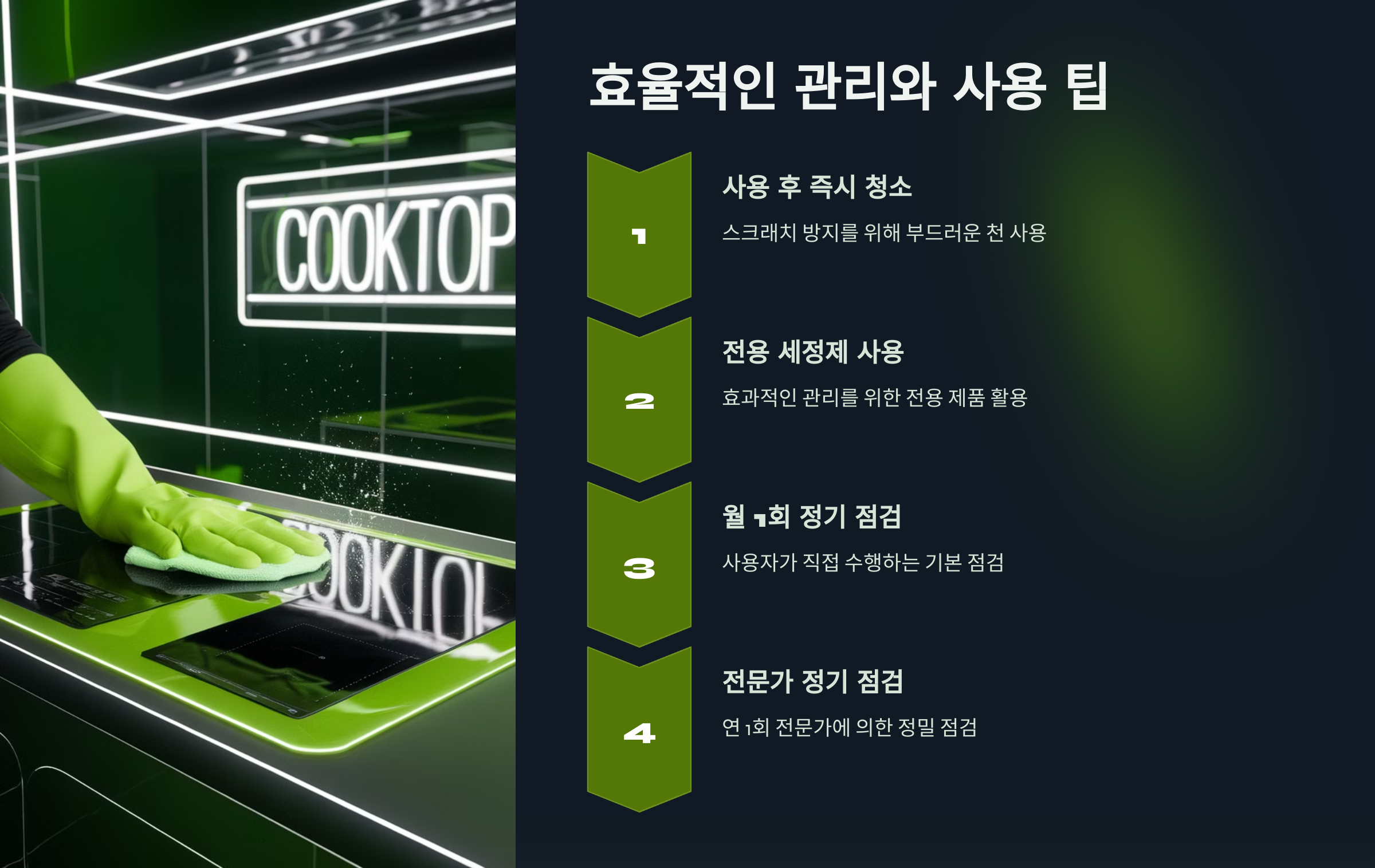 인덕션의 수명과 효율을 높이기 위해서는 적절한 관리가 필수적입니다. 사용 후 즉시 청소하는 습관이 중요합니다. 스크래치 방지를 위해 부드러운 천을 사용해야 합니다. 전용 세정제를 사용하면 더욱 효과적인 관리가 가능합니다. 정기적인 점검으로 문제를 예방할 수 있습니다.