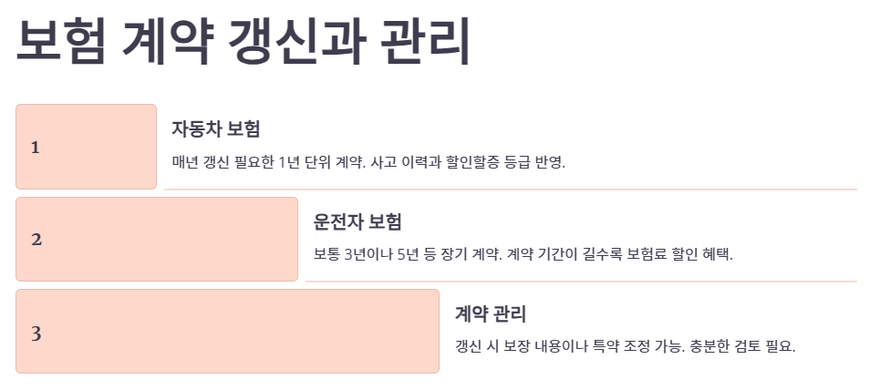 운전자 보험은 보통 3년이나 5년 등 장기 계약으로 가입하는 것이 일반적입니다. 계약 기간이 길수록 보험료 할인 혜택을 받을 수 있으며, 중도 해지 시 불이익이 있을 수 있습니다. 보험 계약 관리에 대한 자세한 내용은 사고 발생 시 운전자 보험이 자동차 보험의 보장 범위 비교에서 확인할 수 있습니다.