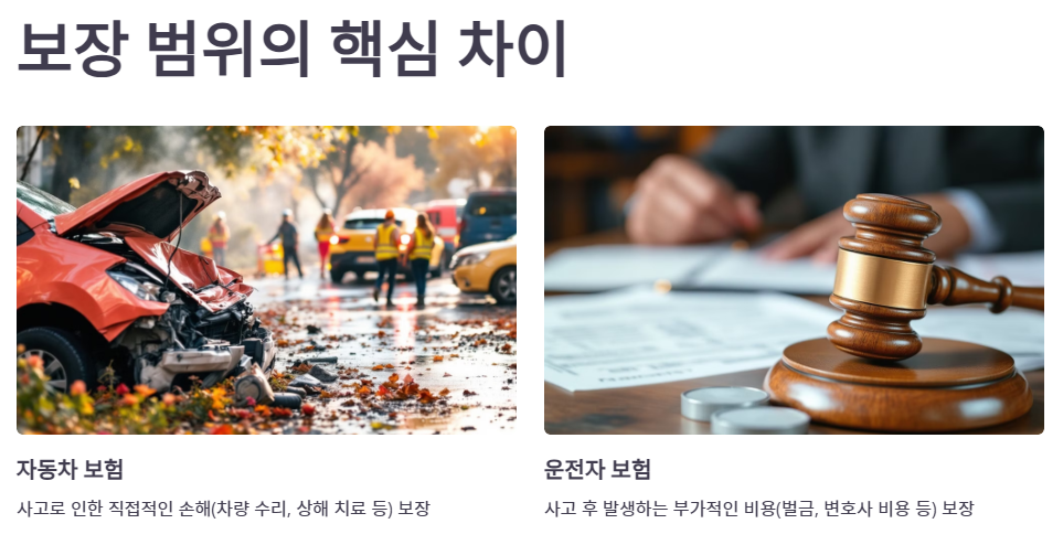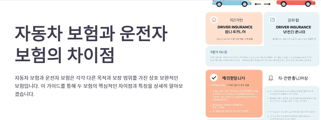 자동차 보험과 운전자 보험의 차이점을 정확히 이해하는 것은 운전자의 안전한 금융 설계를 위해 매우 중요합니다. 자동차 보험과 운전자 보험은 각각 다른 목적과 보장 범위를 가지고 있어 상호 보완적인 역할을 합니다. 이 가이드를 통해 두 보험의 핵심적인 차이점과 특징을 상세히 알아보겠습니다.