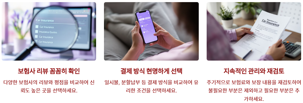 가격이 저렴하더라도 서비스 품질이 떨어지는 보험사는 피해야 합니다. 실제 가입자 리뷰를 통해 보험사의 보상 처리와 고객 서비스 수준을 확인하세요.