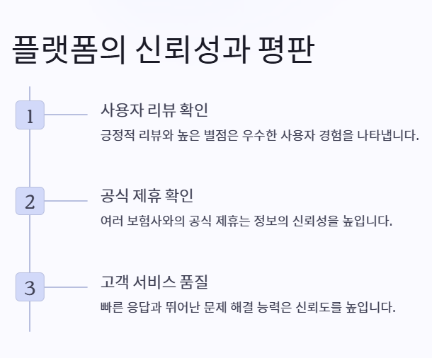 - 해당 플랫폼이 여러 보험사와 공식 제휴를 맺고 있는지 여부를 확인하세요. 이는 제공되는 정보가 신뢰할 만한지 판단하는 기준이 됩니다.