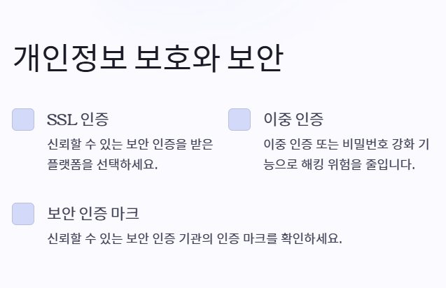 - 플랫폼이 SSL 인증 등 신뢰할 수 있는 보안 인증을 받았는지 확인하세요.