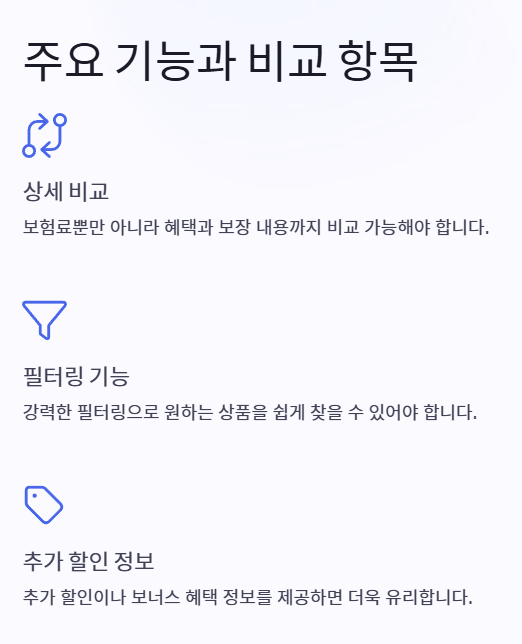 플랫폼에서 제공하는 기능이 얼마나 상세하고 실용적인지는 소비자 경험의 질을 결정합니다. 단순히 보험료만 비교할 수 있는 것이 아니라, 다양한 조건과 혜택까지 확인할 수 있어야 합니다.