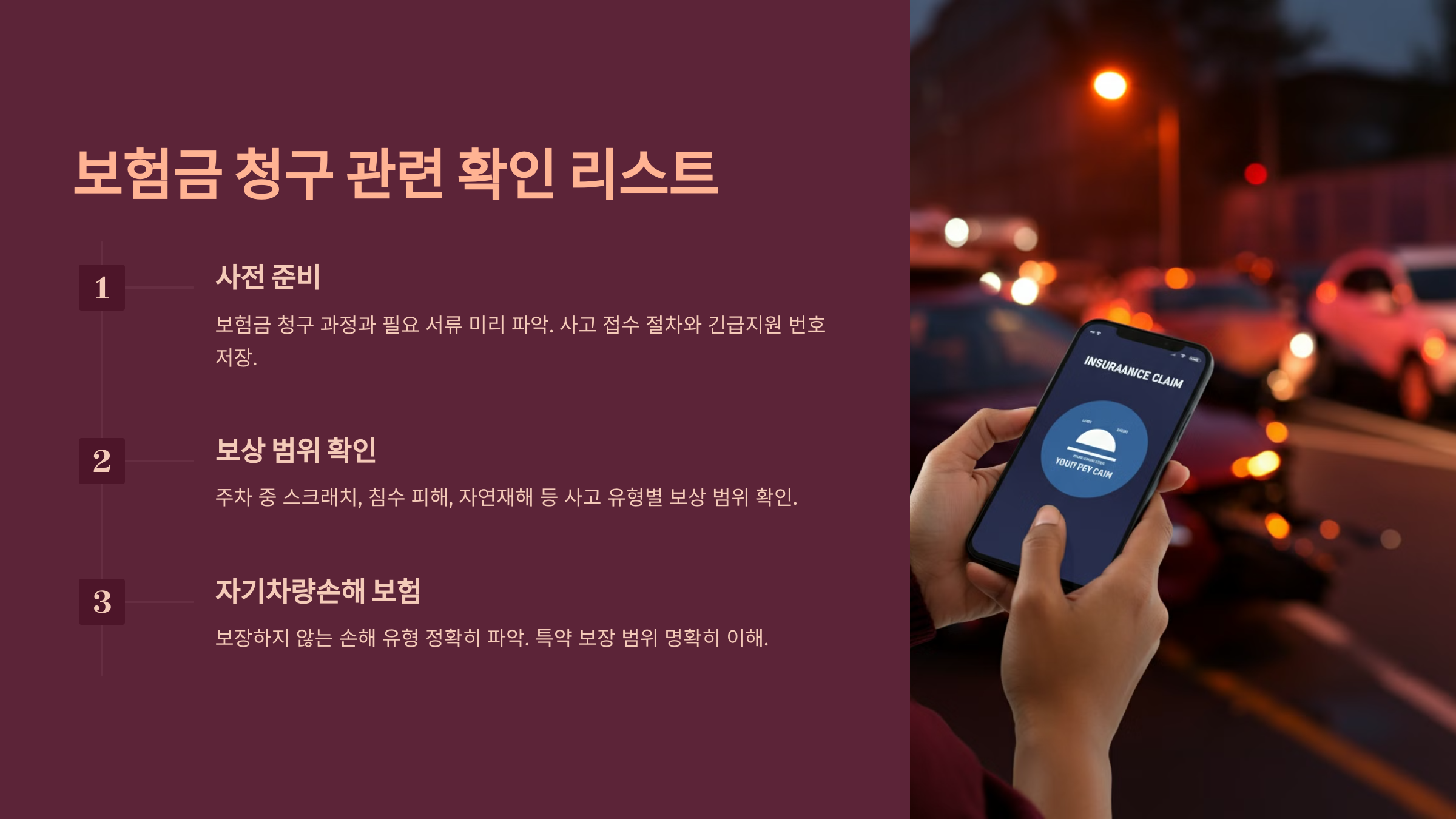 보험금 청구 과정과 필요 서류를 미리 파악해두는 것이 중요합니다. 실제 사고 발생 시 당황하지 않고 대처할 수 있도록, 보험사의 사고 접수 절차와 24시간 긴급지원 번호를 저장해두어야 합니다. C씨의 경우, 사고 후 보험금 청구 시 필요한 서류를 미리 확인해두어 신속한 보상을 받을 수 있었습니다.