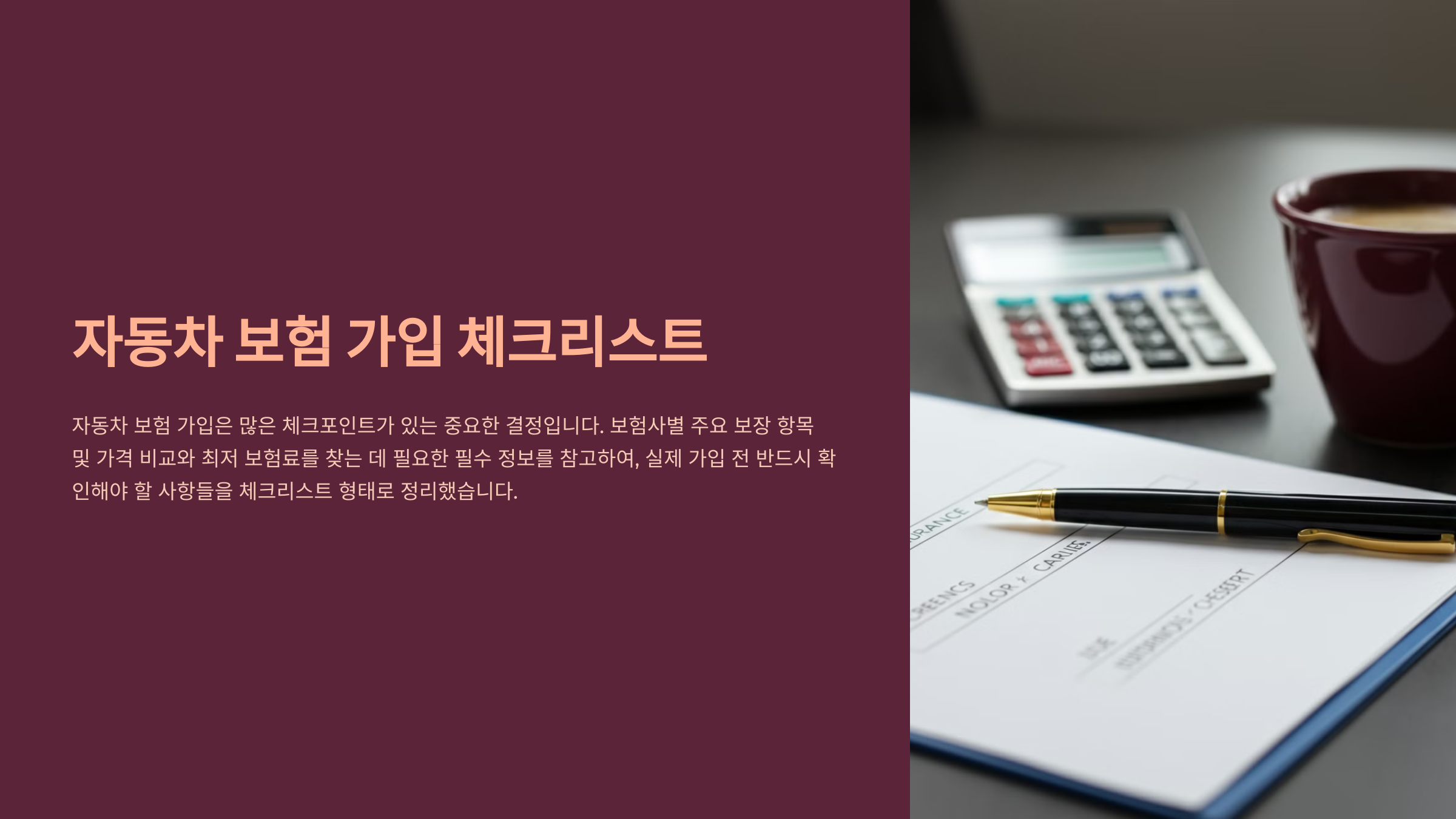 자동차 보험 가입은 많은 체크포인트가 있는 중요한 결정입니다. 보험사별 주요 보장 항목 및 가격 비교하기와 최저 보험료를 찾는 데 필요한 필수 정보를 참고하여, 실제 가입 전 반드시 확인해야 할 사항들을 체크리스트 형태로 정리했습니다.