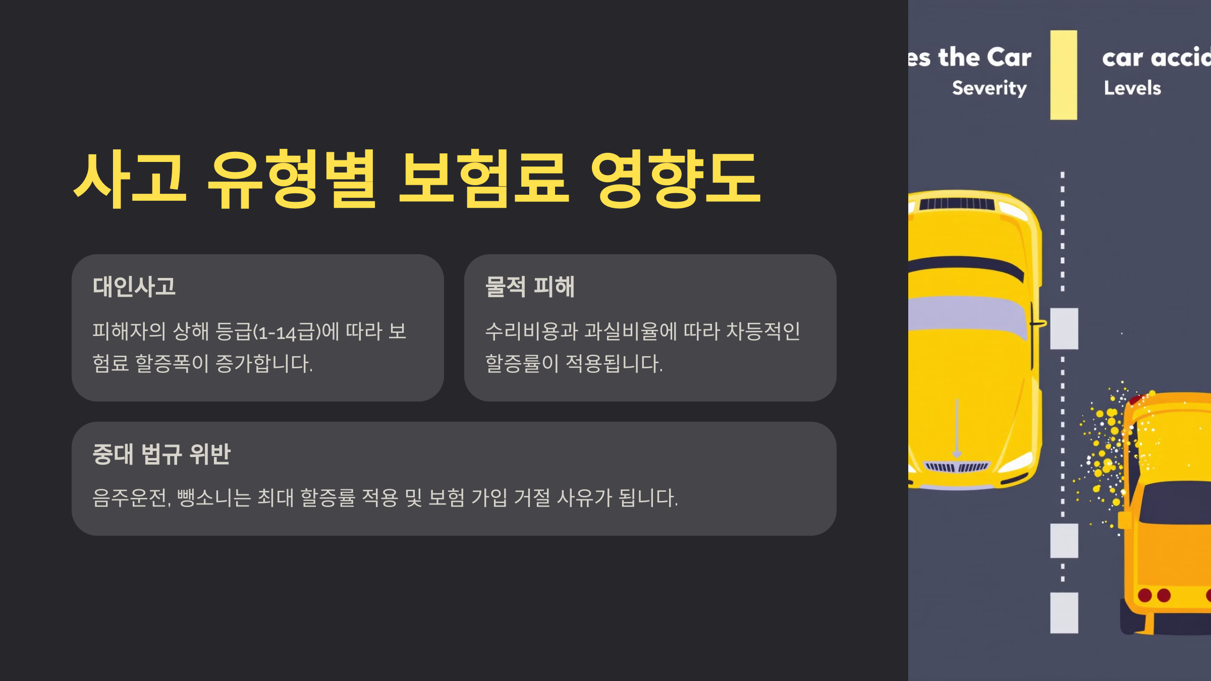 특히 주목해야 할 것은 음주운전이나 뺑소니와 같은 중대 법규 위반 사고입니다. 이러한 사고들은 최대 할증률이 적용될 뿐만 아니라, 보험 가입 거절의 사유가 될 수도 있습니다. 반면, 자차 피해만 있는 단독사고나 소액 물적 피해 사고의 경우 비교적 낮은 할증률이 적용되어 보험료 상승폭이 제한적입니다.