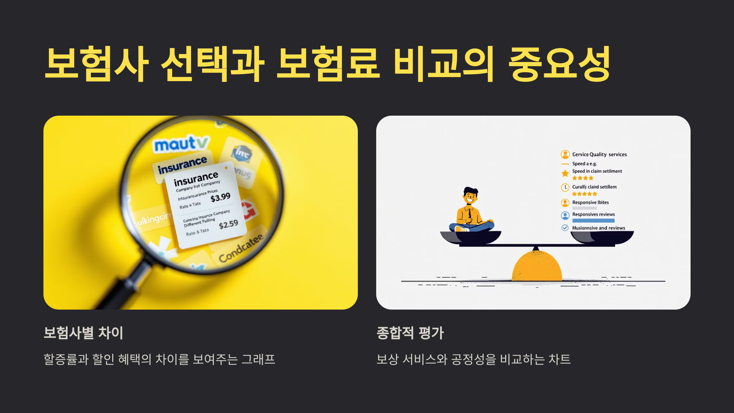 보험사 선택 시에는 보험료 수준뿐만 아니라 보상 서비스의 질과 보험금 지급 심사의 공정성도 고려해야 합니다. 저렴한 보험료만을 중시하다가 보상 서비스에서 불이익을 받을 수 있으므로, 보험사의 신뢰도와 서비스 품질을 종합적으로 평가하여 선택하는 것이 바람직합니다.
