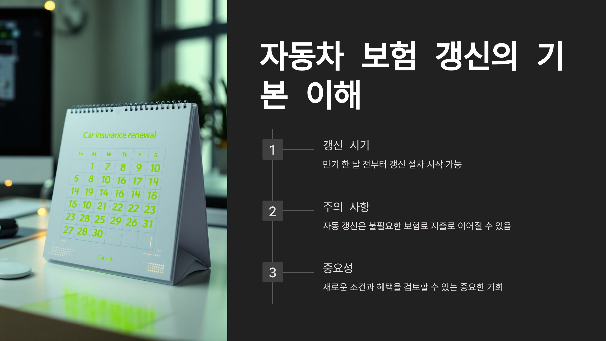 자동차 보험은 일반적으로 1년 단위로 계약이 이루어지며, 만기 한 달 전부터 갱신 절차를 시작할 수 있습니다. 보험 갱신 시기가 다가오면 보험사는 계약자에게 갱신 안내문을 발송하지만, 많은 운전자들이 이를 제대로 확인하지 않고 자동 갱신을 선택하는 경우가 많습니다. 하지만 자동 갱신은 때때로 불필요한 보험료 지출로 이어질 수 있어 주의가 필요합니다.