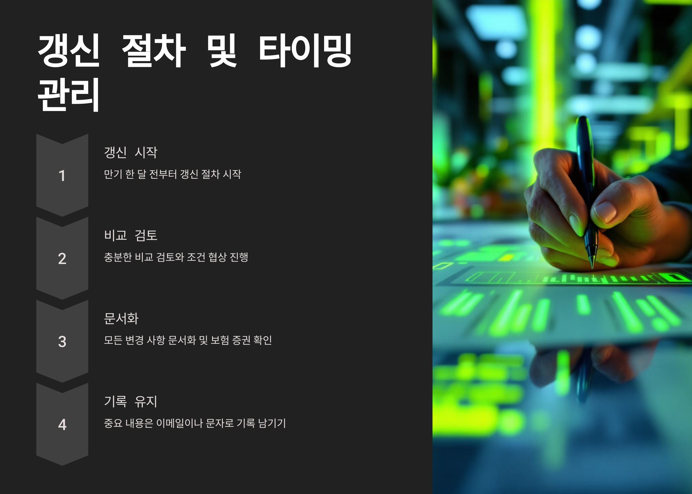 갱신 시에는 모든 변경 사항을 문서화하고 보험 증권을 꼼꼼히 확인하는 것이 중요합니다. 계약 내용이 협의한 사항과 다르거나 누락된 부분이 없는지 검토해야 하며, 특히 특약과 할인 적용 여부를 반드시 확인해야 합니다. 또한 향후 분쟁 예방을 위해 중요한 내용은 이메일이나 문자로 기록을 남기는 것이 좋습니다.