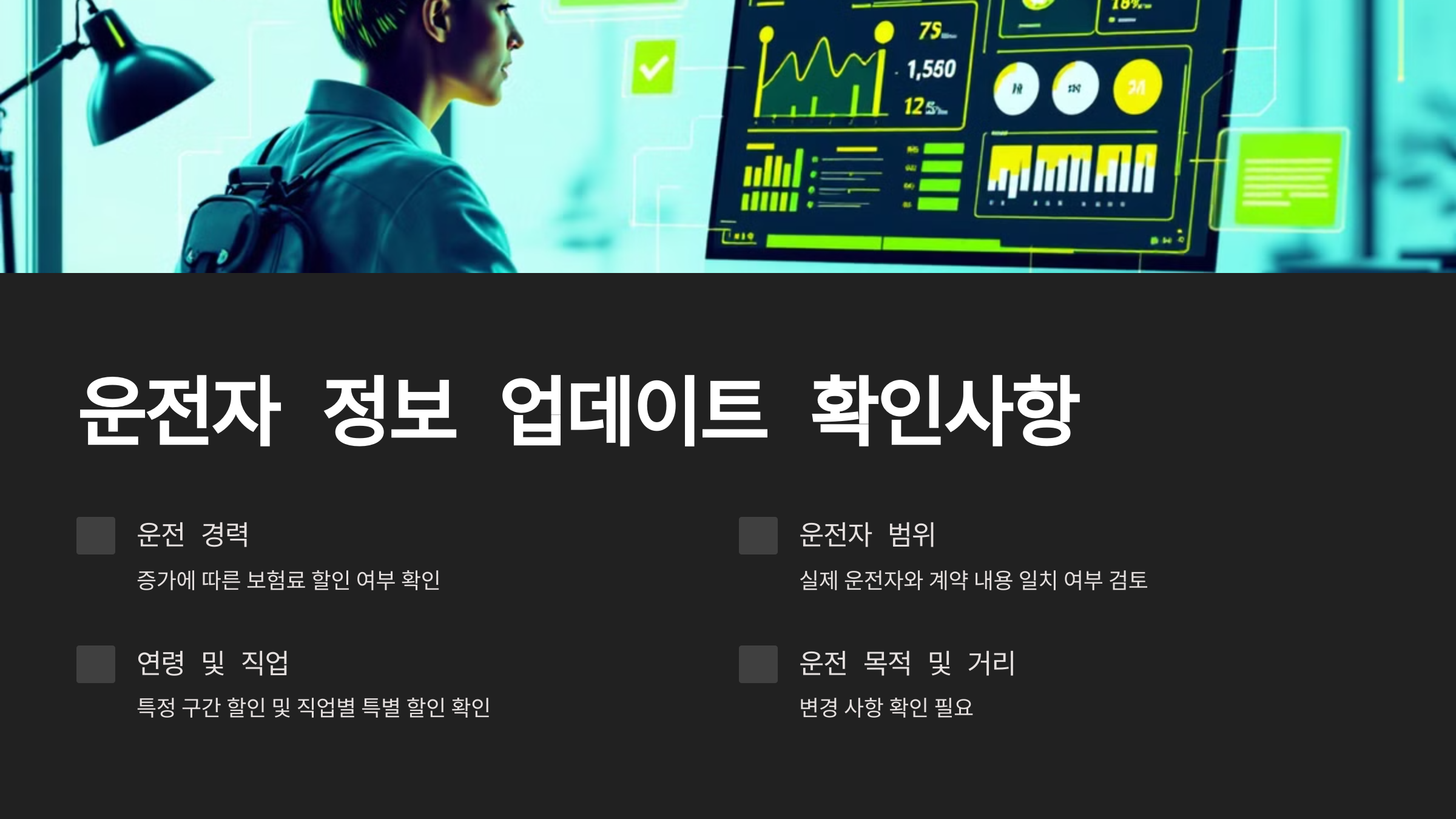 운전자의 연령과 직업 정보도 중요한 체크포인트입니다. 운전자의 나이가 특정 구간을 넘어가면 추가 할인이 적용될 수 있으며, 직업에 따른 특별 할인 혜택도 있을 수 있습니다. 또한 운전 목적이나 주행 거리의 변경 사항도 꼭 확인해야 하는 항목 중 하나입니다.