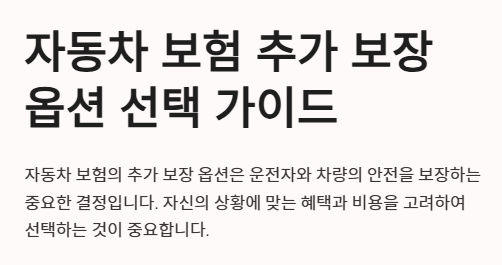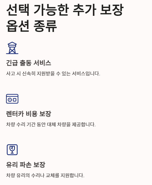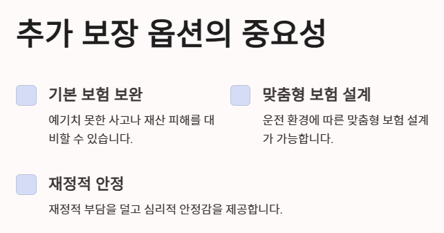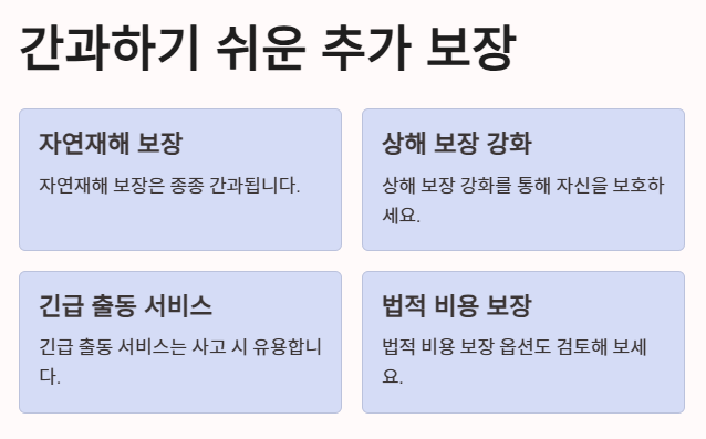 추가 보장은 기본 자동차 보험이 커버하지 못하는 부분을 보완해줍니다.