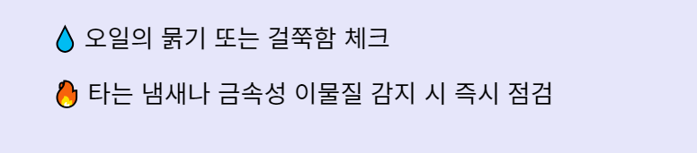 - 타는 냄새나 금속성 이물질이 느껴질 경우, 이는 오일이 열화되었거나 엔진에 문제가 있음을 나타내므로 즉시 점검 및 교환을 고려해야 합니다.