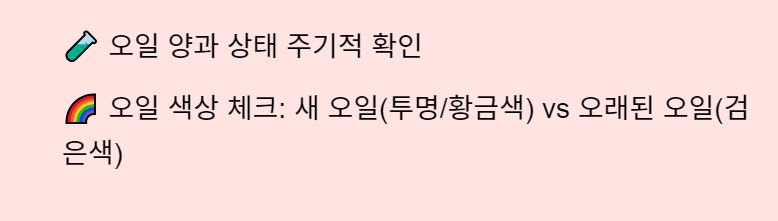 - 오일의 색상: 새 오일은 투명하거나 약간 황금색을 띠지만, 오래된 오일은 검게 변할 수 있습니다. 오일이 지나치게 검거나 찌꺼기가 많이 섞여 있으면 교환이 필요합니다.