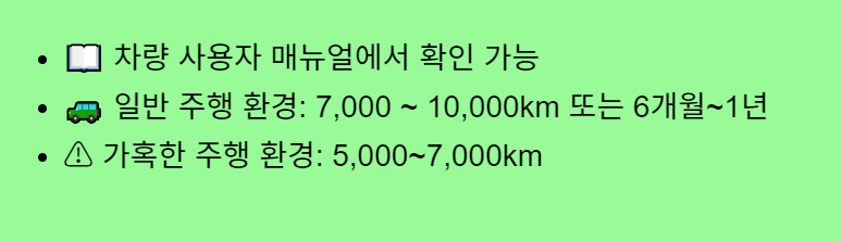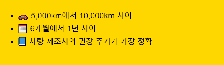 일반 주행 환경: 7,000 ~ 10,000km, 혹은 6개월~1년 주기로 교체.