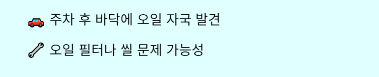 차량 주차 후 바닥에 오일이 새어나오는 자국이 보이면 오일이 누출되고 있는 것일 수 있습니다. 이는 오일 필터나 씰 문제일 수 있으므로 즉시 정비소를 방문해 점검하고, 누출된 오일은 보충하거나 교체해야 합니다.