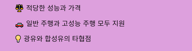 반합성유: 광유와 합성유의 중간 단계로, 적당한 성능과 가격을 갖춘 선택지입니다. 일반 주행과 고성능 주행을 모두 지원하는 타협점으로 많이 사용됩니다.