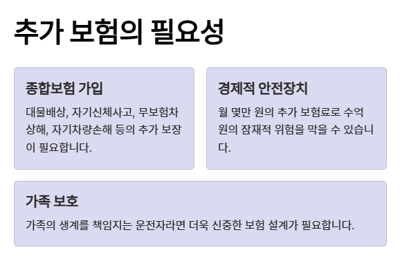 A: 책임보험만으로는 자기차량 손해, 고액의 대물배상, 자신의 상해, 무보험차 사고 등에 대한 보장이 없어 심각한 재정적 위험에 노출될 수 있습니다.